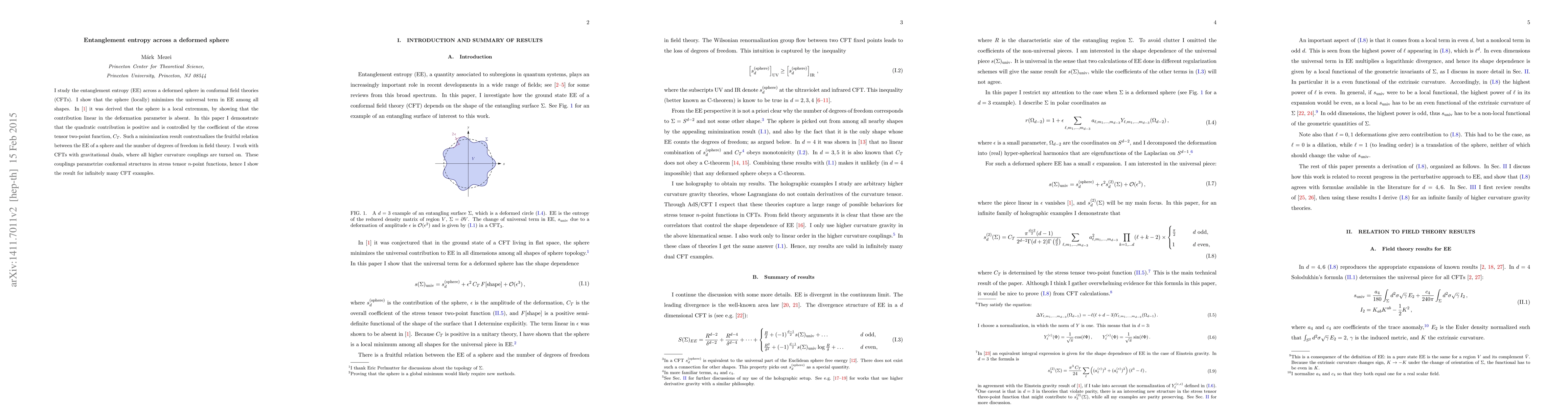 This research proves that a deformed sphere in Conformal Field Theories (CFTs) does not minimize entanglement entropy (EE) as effectively as a standard sphere, which is a local extremum. The study demonstrates that the positive quadratic contribution to EE in deformed spheres is controlled by the stress tensor two-point function coefficient, C_T, contextualizing the relationship between EE and degrees of freedom in CFTs. The analysis encompasses CFTs with gravitational duals, considering all higher curvature couplings, thereby providing insights for infinitely many CFT examples.