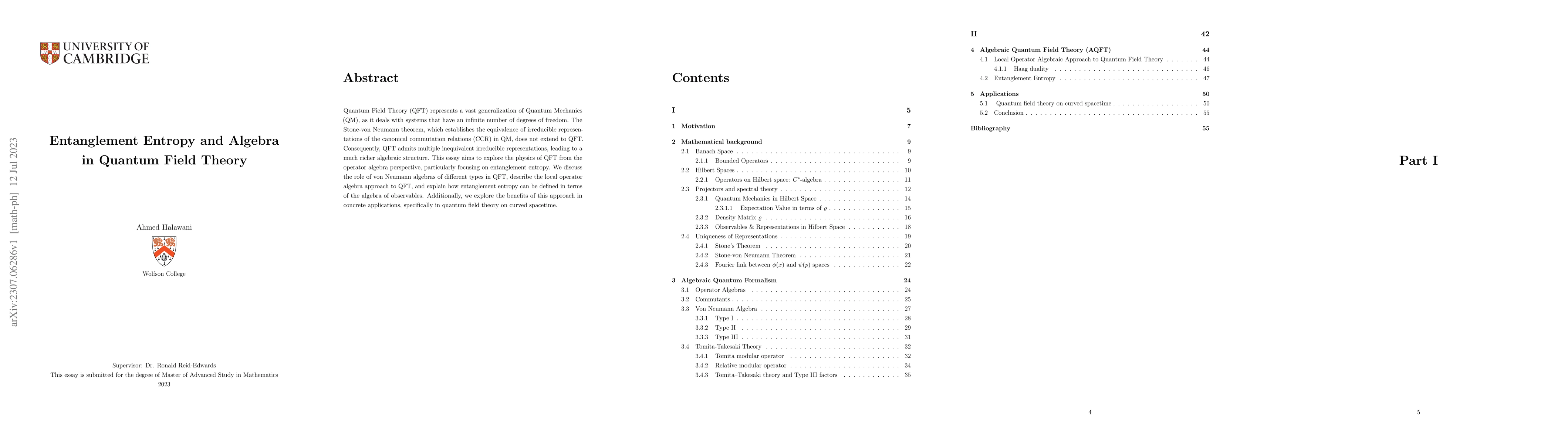 Quantum Field Theory (QFT) represents a vast generalization of Quantum Mechanics (QM), as it deals with systems that have an infinite number of degrees of freedom. The Stone-von Neumann theorem, which establishes the equivalence of irreducible representations of the canonical commutation relations (CCR) in QM, does not extend to QFT. Consequently, QFT admits multiple inequivalent irreducible representations, leading to a much richer algebraic structure. This essay aims to explore the physics of QFT from the operator algebra perspective, particularly focusing on entanglement entropy. We discuss the role of von Neumann algebras of different types in QFT, describe the local operator algebra approach to QFT, and explain how entanglement entropy can be defined in terms of the algebra of observables. Additionally, we explore the benefits of this approach in concrete applications, specifically in quantum field theory on curved spacetime.