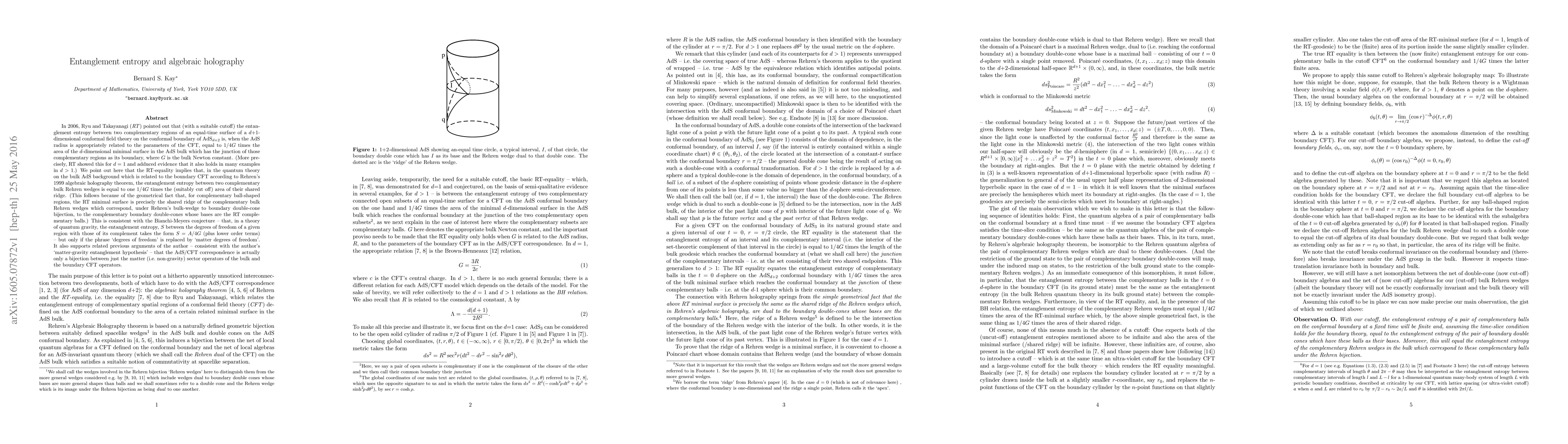 In 2006, Ryu and Takayanagi (RT) pointed out that (with a suitable cutoff) the entanglement entropy between two complementary regions of an equal-time surface of a d+1-dimensional conformal field theory on the conformal boundary of AdS_{d+2} is, when the AdS radius is appropriately related to the parameters of the CFT, equal to 1/4G times the area of the d-dimensional minimal surface in the AdS bulk which has the junction of those complementary regions as its boundary, where G is the bulk Newton constant. We point out here that the RT-equality implies that, in the quantum theory on the bulk AdS background which is related to the boundary CFT according to Rehren's 1999 algebraic holography theorem, the entanglement entropy between two complementary bulk Rehren wedges is equal to 1/4G times the (suitably cut off) area of their shared ridge. (This follows because of the geometrical fact that, for complementary ball-shaped regions, the RT minimal surface is precisely the shared ridge of the complementary bulk Rehren wedges which correspond, under Rehren's bulk-wedge to boundary double-cone bijection, to the complementary boundary double-cones whose bases are the RT complementary balls.) This is consistent with the Bianchi-Meyers conjecture -- that, in a theory of quantum gravity, the entanglement entropy, S, between the degrees of freedom of a given region with those of its complement is S = A/4G (+ lower order terms) -- but only if the phrase 'degrees of freedom' is replaced by 'matter degrees of freedom'. It also supports related previous arguments of the author -- consistent with the author's 'matter-gravity entanglement hypothesis' -- that the AdS/CFT correspondence is actually only a bijection between just the matter (i.e. non-gravity) sector operators of the bulk and the boundary CFT operators.