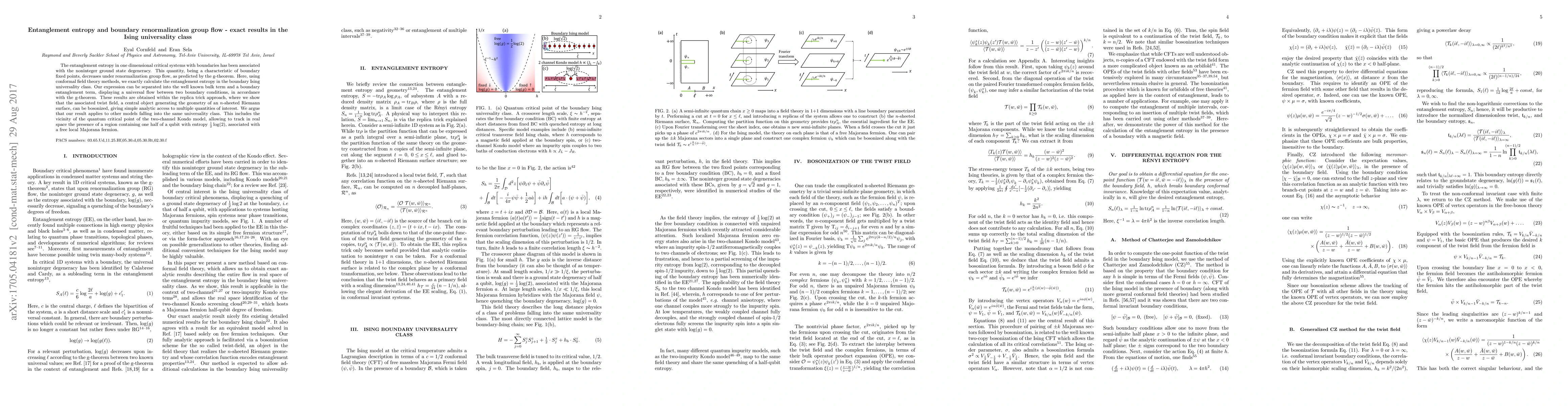 The entanglement entropy in one dimensional critical systems with boundaries has been associated with the noninteger ground state degeneracy. This quantity, being a characteristic of boundary fixed points, decreases under renormalization group flow, as predicted by the g-theorem. Here, using conformal field theory methods, we exactly calculate the entanglement entropy in the boundary Ising universality class. Our expression can be separated into the well known bulk term and a boundary entanglement term, displaying a universal flow between two boundary conditions, in accordance with the g-theorem. These results are obtained within the replica trick approach, where we show that the associated twist field, a central object generating the geometry of an $n$-sheeted Riemann surface, can be bosonized, giving simple analytic access to multiple quantities of interest. We argue that our result applies to other models falling into the same universality class. This includes the vicinity of the quantum critical point of the two-channel Kondo model, allowing to track in real space the presence of a region containing one half of a qubit with entropy $\frac{1}{2} \log (2)$, associated with a free local Majorana fermion.