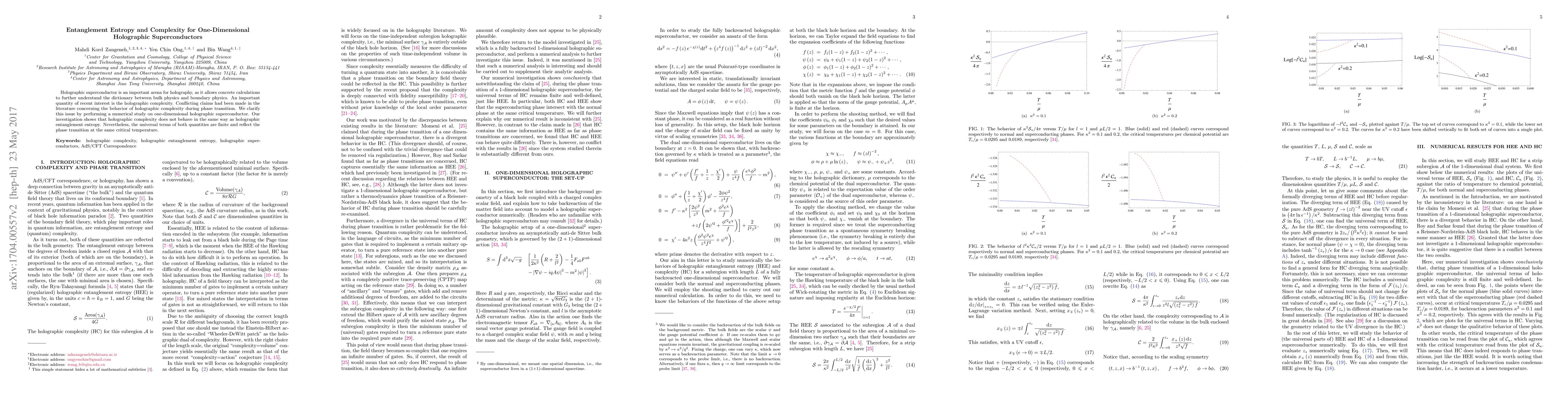 Researchers investigated one-dimensional holographic superconductors to clarify a long-standing debate about holographic complexity and entanglement entropy during phase transitions. They found that while both quantities behave similarly at critical temperatures, they don't follow the same behavior otherwise.