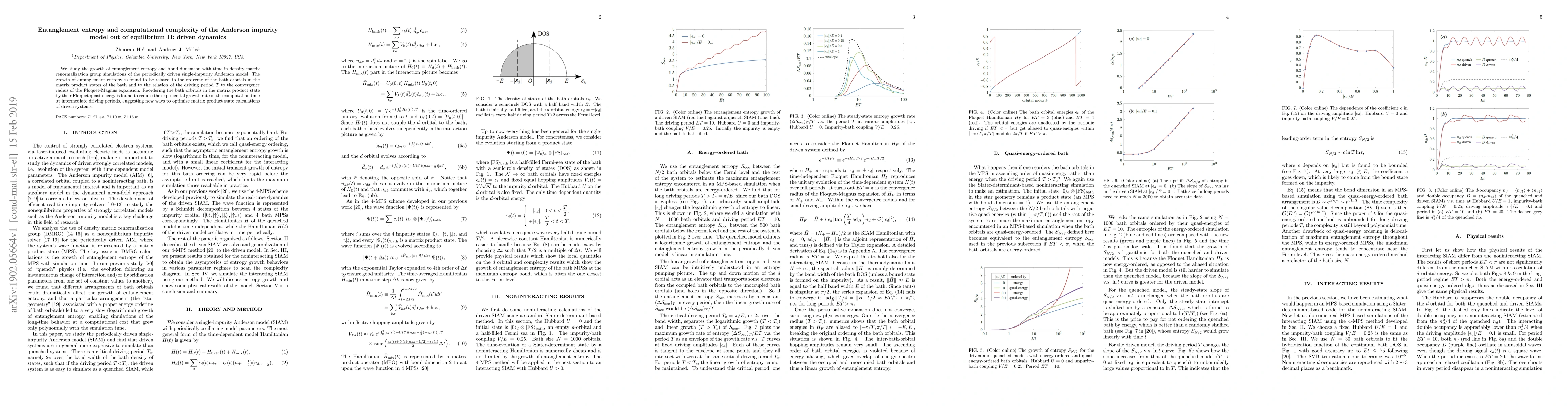 We study the growth of entanglement entropy and bond dimension with time in density matrix renormalization group simulations of the periodically driven single-impurity Anderson model. The growth of entanglement entropy is found to be related to the ordering of the bath orbitals in the matrix product states of the bath and to the relation of the driving period $T$ to the convergence radius of the Floquet-Magnus expansion. Reordering the bath orbitals in the matrix product state by their Floquet quasi-energy is found to reduce the exponential growth rate of the computation time at intermediate driving periods, suggesting new ways to optimize matrix product state calculations of driven systems.