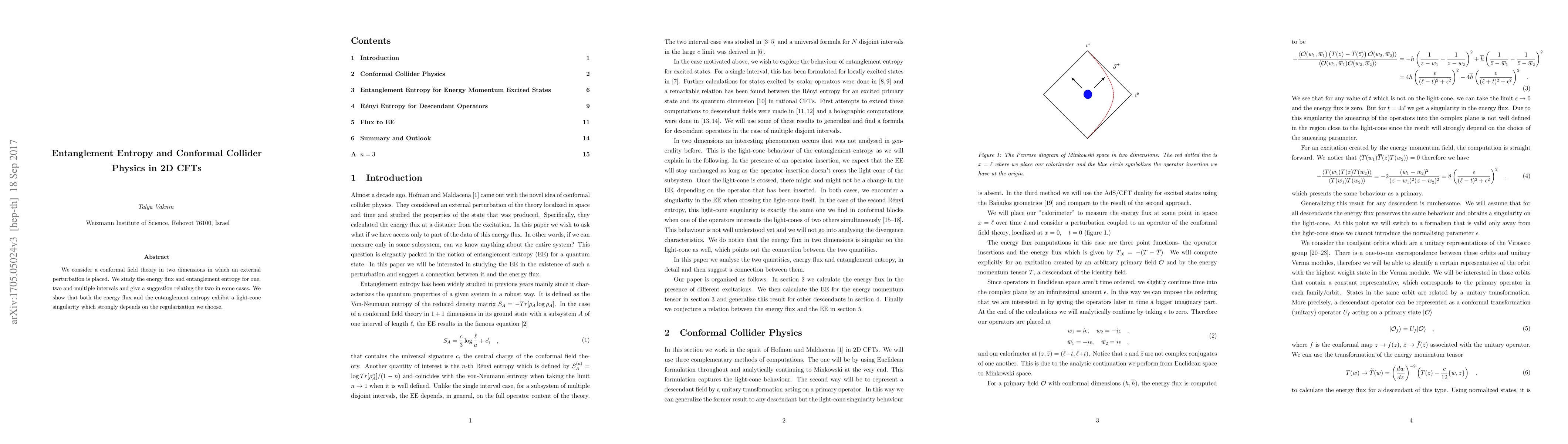 We consider a conformal field theory in two dimensions in which an external perturbation is placed. We study the energy flux and entanglement entropy for one, two and multiple intervals and give a suggestion relating the two in some cases. We show that both the energy flux and the entanglement entropy exhibit a light-cone singularity which strongly depends on the regularization we choose.