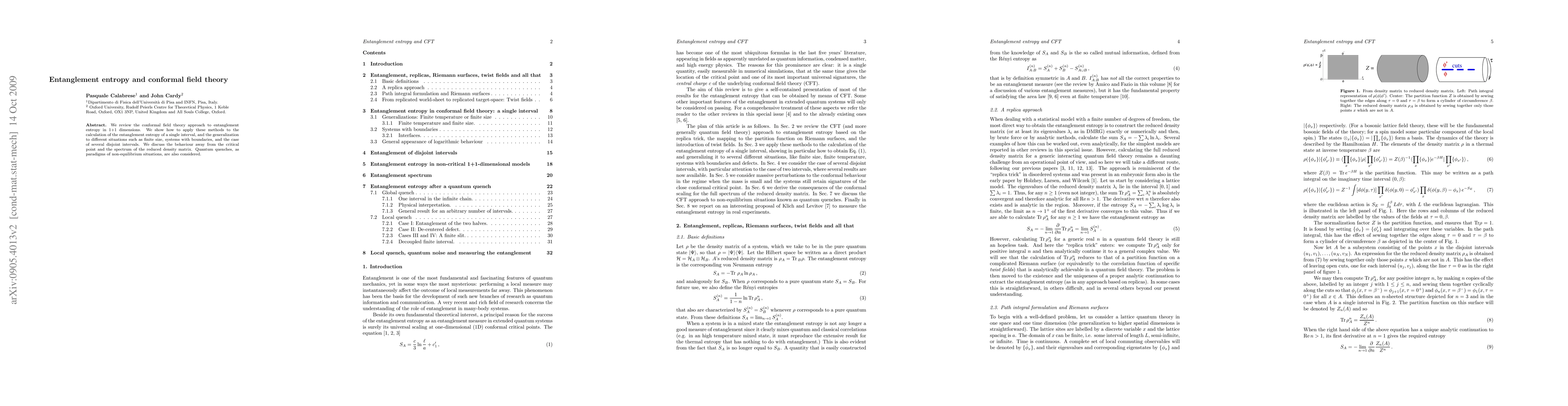 This paper reviews the conformal field theory (CFT) method for calculating entanglement entropy, demonstrating its application to single and multiple intervals, finite size systems, and boundaries. It further explores entanglement dynamics in non-equilibrium scenarios like quantum quenches.