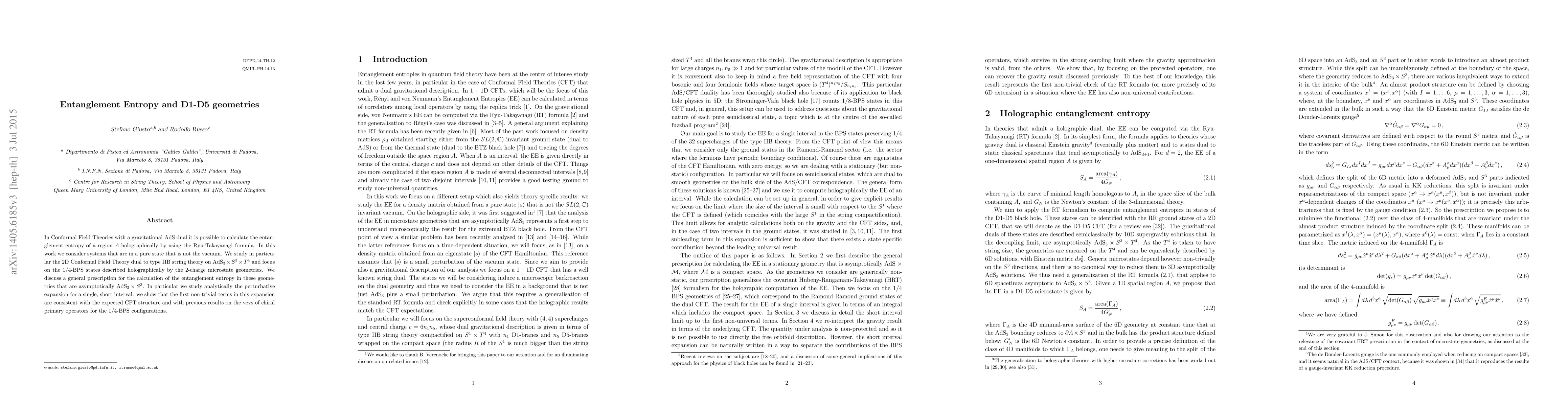 In Conformal Field Theories with a gravitational AdS dual it is possible to calculate the entanglement entropy of a region $A$ holographically by using the Ryu-Takayanagi formula. In this work we consider systems that are in a pure state that is not the vacuum. We study in particular the 2D Conformal Field Theory dual to type IIB string theory on AdS$_3 \times S^3 \times T^4$ and focus on the $1/4$-BPS states described holographically by the 2-charge microstate geometries. We discuss a general prescription for the calculation of the entanglement entropy in these geometries that are asymptotically AdS$_3 \times S^3$. In particular we study analytically the perturbative expansion for a single, short interval: we show that the first non-trivial terms in this expansion are consistent with the expected CFT structure and with previous results on the vevs of chiral primary operators for the $1/4$-BPS configurations.