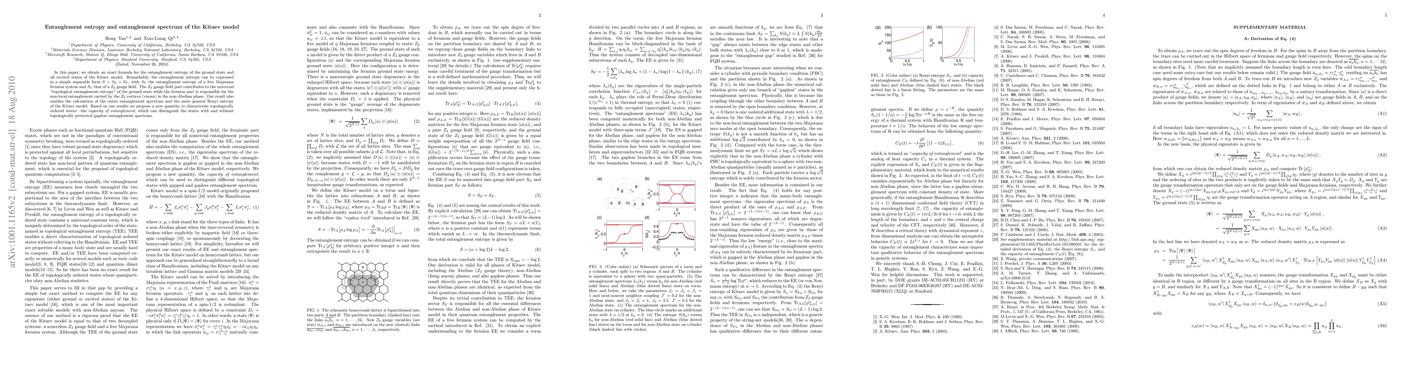 This paper derives an exact formula for the entanglement entropy of the Kitaev model, revealing a separable form involving contributions from a free Majorana fermion system and a Z_2 gauge field. It also introduces a new measure, the capacity of entanglement, to distinguish topologically ordered states with protected gapless entanglement spectrum.