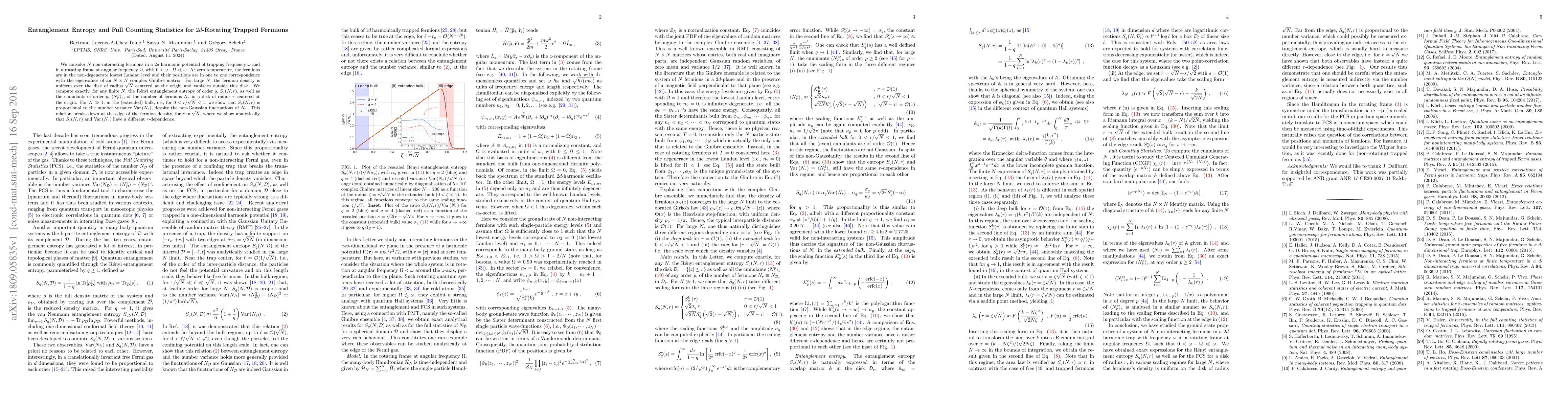 We consider $N$ non-interacting fermions in a $2d$ harmonic potential of trapping frequency $\omega$ and in a rotating frame at angular frequency $\Omega$, with $0<\omega - \Omega\ll \omega$. At zero temperature, the fermions are in the non-degenerate lowest Landau level and their positions are in one to one correspondence with the eigenvalues of an $N\times N$ complex Ginibre matrix. For large $N$, the fermion density is uniform over the disk of radius $\sqrt{N}$ centered at the origin and vanishes outside this disk. We compute exactly, for any finite $N$, the R\'enyi entanglement entropy of order $q$, $S_q(N,r)$, as well as the cumulants of order $p$, $\langle{N_r^{p}}\rangle_c$, of the number of fermions $N_r$ in a disk of radius $r$ centered at the origin. For $N \gg 1$, in the (extended) bulk, i.e., for $0 < r/\sqrt{N} < 1$, we show that $S_q(N,r)$ is proportional to the number variance ${\rm Var}\,(N_r)$, despite the non-Gaussian fluctuations of $N_r$. This relation breaks down at the edge of the fermion density, for $r \approx \sqrt{N}$, where we show analytically that $S_q(N,r)$ and ${\rm Var}\,(N_r)$ have a different $r$-dependence.
