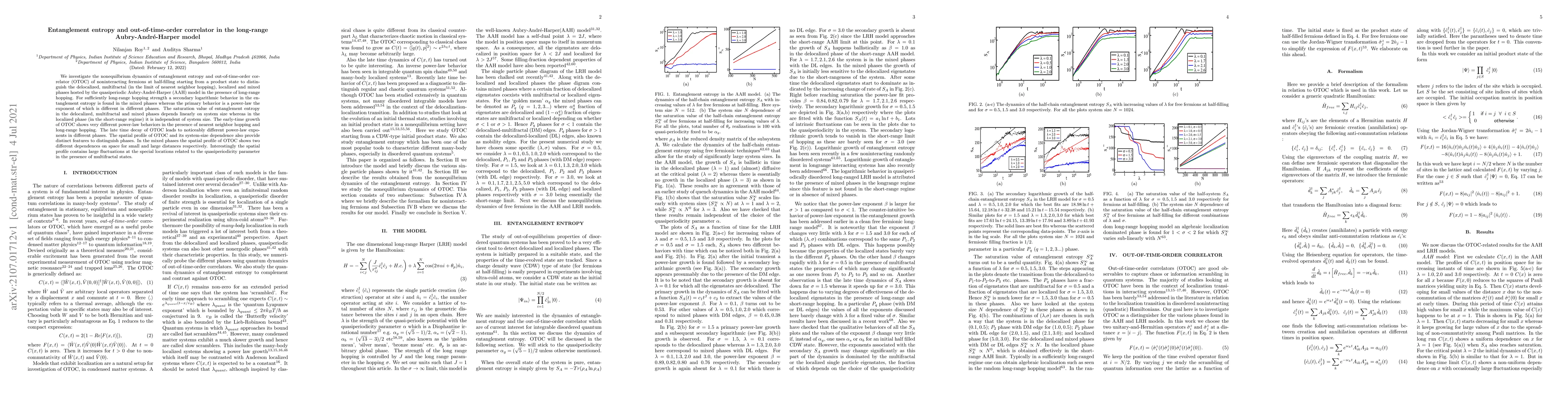 We investigate the nonequilbrium dynamics of entanglement entropy and out-of-time-order correlator (OTOC) of noninteracting fermions at half-filling starting from a product state to distinguish the delocalized, multifractal (in the limit of nearest neighbor hopping), localized and mixed phases hosted by the quasiperiodic Aubry-Andr\'e-Harper (AAH) model in the presence of long-range hopping. For sufficiently long-range hopping strength a secondary logarithmic behavior in the entanglement entropy is found in the mixed phases whereas the primary behavior is a power-law the exponent of which is different in different phases. The saturation value of entanglement entropy in the delocalized, multifractal and mixed phases depends linearly on system size whereas in the localized phase (in the short-range regime) it is independent of system size. The early-time growth of OTOC shows very different power-law behaviors in the presence of nearest neighbor hopping and long-range hopping. The late time decay of OTOC leads to noticeably different power-law exponents in different phases. The spatial profile of OTOC and its system-size dependence also provide distinct features to distinguish phases. In the mixed phases the spatial profile of OTOC shows two different dependences on space for small and large distances respectively. Interestingly the spatial profile contains large fluctuations at the special locations related to the quasiperiodicity parameter in the presence of multifractal states.