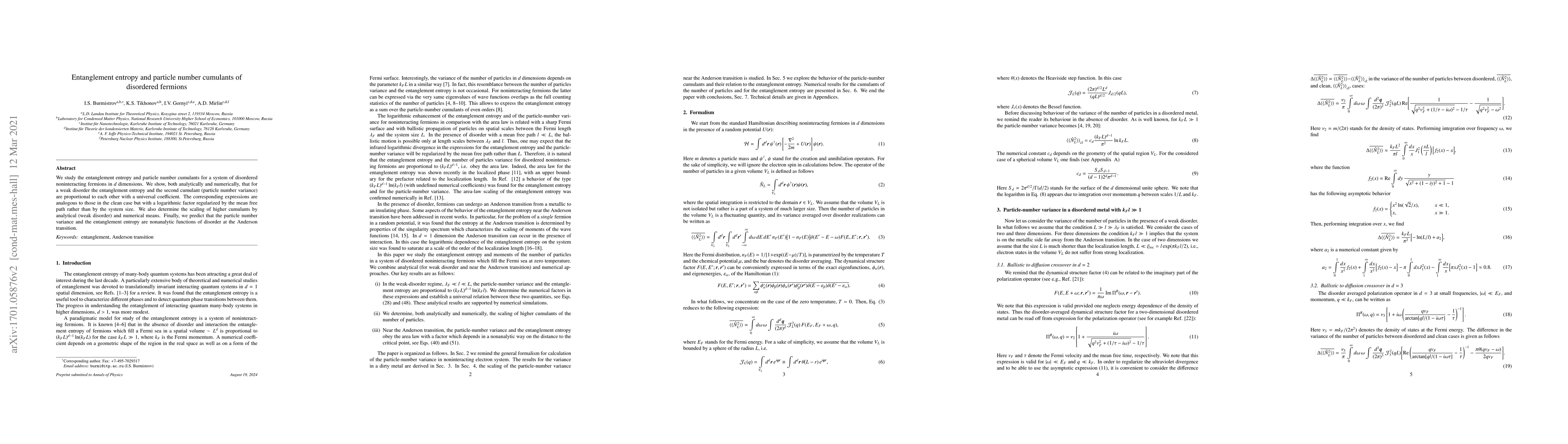 This paper investigates entanglement entropy and particle number cumulants in disordered noninteracting fermions, showing a proportional relationship between entanglement entropy and the second cumulant with a universal coefficient. The study reveals that weak disorder modifies the scaling of these quantities, introducing a logarithmic factor dependent on the mean free path.