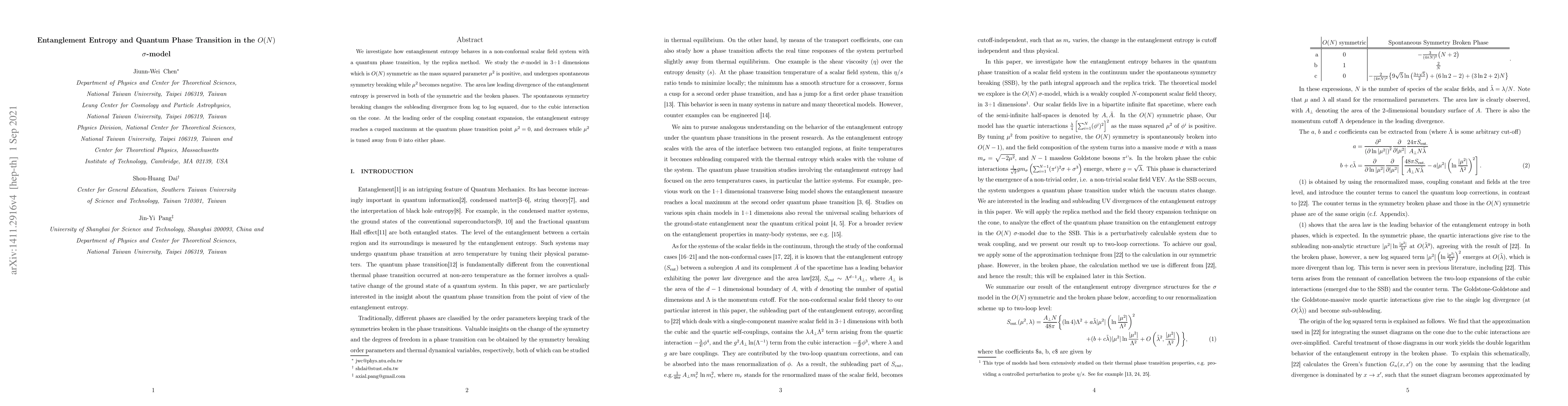 We investigate how entanglement entropy behaves in a non-conformal scalar field system with a quantum phase transition, by the replica method. We study the $\sigma$-model in 3+1 dimensions which is $O(N)$ symmetric as the mass squared parameter $\mu^{2}$ is positive, and undergoes spontaneous symmetry breaking while $\mu^{2}$ becomes negative. The area law leading divergence of the entanglement entropy is preserved in both of the symmetric and the broken phases. The spontaneous symmetry breaking changes the subleading divergence from log to log squared, due to the cubic interaction on the cone. At the leading order of the coupling constant expansion, the entanglement entropy reaches a cusped maximum at the quantum phase transition point $\mu^{2}=0$, and decreases while $\mu^{2}$ is tuned away from 0 into either phase.