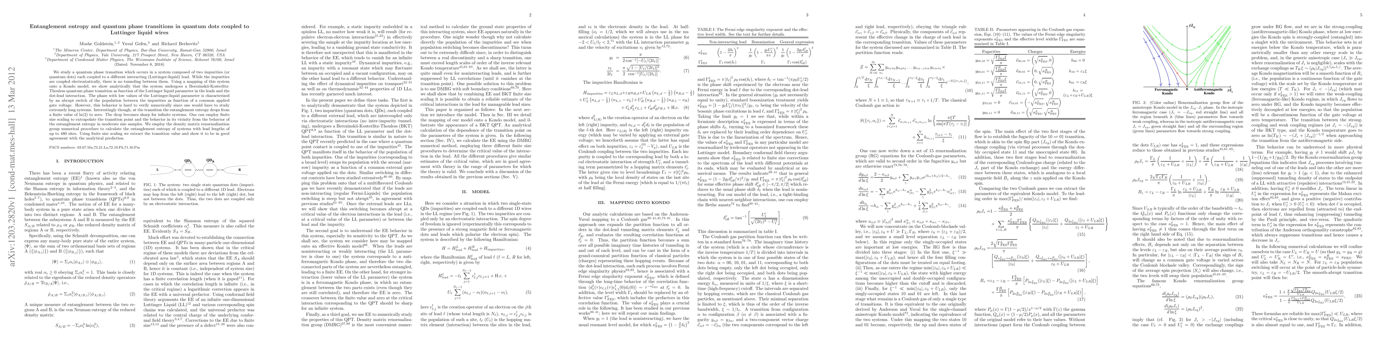 This paper investigates a quantum phase transition in a system of quantum dots coupled to Luttinger liquid wires, demonstrating a Berezinskii-Kosterlitz-Thouless transition via analytical mapping to a Kondo model. The entanglement entropy drops sharply to zero at the transition point, providing a numerical method for determining the transition value.