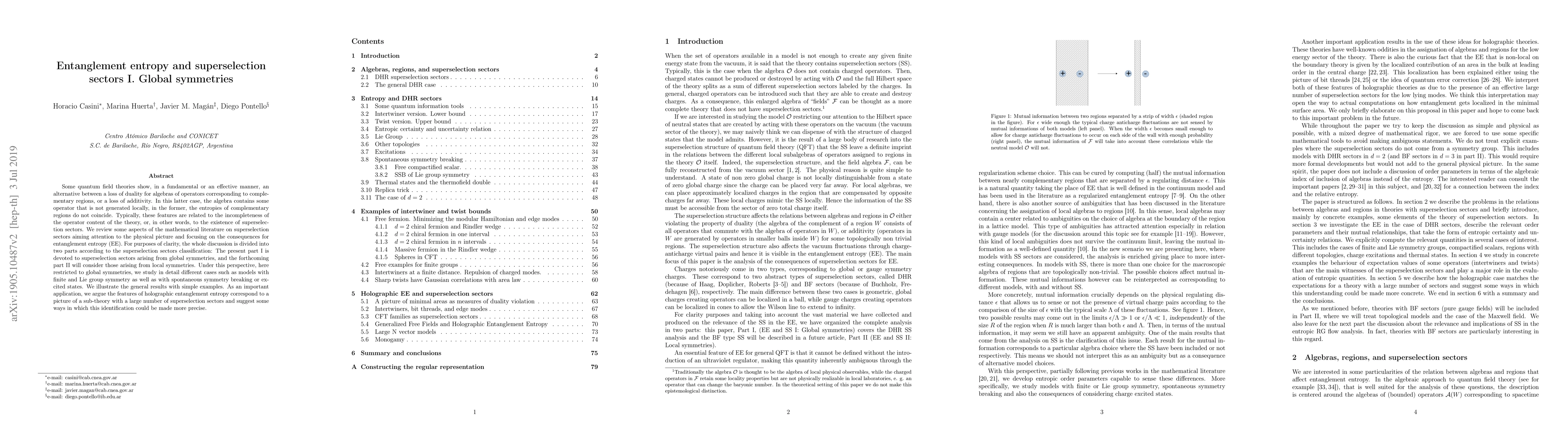 Some quantum field theories show, in a fundamental or an effective manner, an alternative between a loss of duality for algebras of operators corresponding to complementary regions, or a loss of additivity. In this latter case, the algebra contains some operator that is not generated locally, in the former, the entropies of complementary regions do not coincide. Typically, these features are related to the incompleteness of the operator content of the theory, or, in other words, to the existence of superselection sectors. We review some aspects of the mathematical literature on superselection sectors aiming attention to the physical picture and focusing on the consequences for entanglement entropy (EE). For purposes of clarity, the whole discussion is divided into two parts according to the superselection sectors classification: The present part I is devoted to superselection sectors arising from global symmetries, and the forthcoming part II will consider those arising from local symmetries. Under this perspective, here restricted to global symmetries, we study in detail different cases such as models with finite and Lie group symmetry as well as with spontaneous symmetry breaking or excited states. We illustrate the general results with simple examples. As an important application, we argue the features of holographic entanglement entropy correspond to a picture of a sub-theory with a large number of superselection sectors and suggest some ways in which this identification could be made more precise.