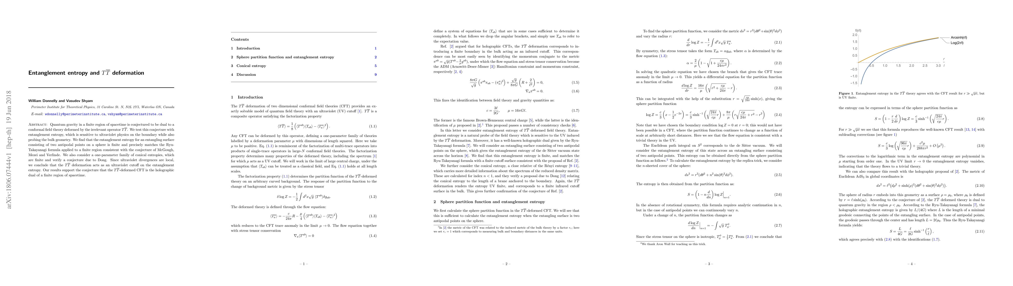 Quantum gravity in a finite region of spacetime is conjectured to be dual to a conformal field theory deformed by the irrelevant operator $T \overline{T}$. We test this conjecture with entanglement entropy, which is sensitive to ultraviolet physics on the boundary while also probing the bulk geometry. We find that the entanglement entropy for an entangling surface consisting of two antipodal points on a sphere is finite and precisely matches the Ryu-Takayanagi formula applied to a finite region consistent with the conjecture of McGough, Mezei and Verlinde. We also consider a one-parameter family of conical entropies, which are finite and verify a conjecture due to Dong. Since ultraviolet divergences are local, we conclude that the $T \overline{T}$ deformation acts as an ultraviolet cutoff on the entanglement entropy. Our results support the conjecture that the $T \overline{T}$-deformed CFT is the holographic dual of a finite region of spacetime.