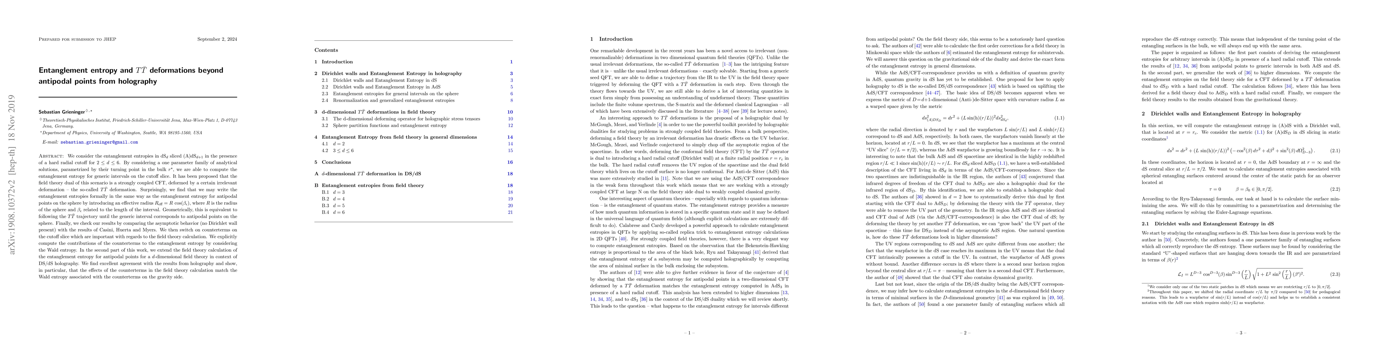 We consider the entanglement entropies in dS$_d$ sliced (A)dS$_{d+1}$ in the presence of a hard radial cutoff for $2\le d\le 6$. By considering a one parameter family of analytical solutions, parametrized by their turning point in the bulk $r^\star$, we are able to compute the entanglement entropy for generic intervals on the cutoff slice. It has been proposed that the field theory dual of this scenario is a strongly coupled CFT, deformed by a certain irrelevant deformation -- the so-called $T\bar T$ deformation. Surprisingly, we find that we may write the entanglement entropies formally in the same way as the entanglement entropy for antipodal points on the sphere by introducing an effective radius $R_\text{eff}=R\,\cos(\beta_\epsilon)$, where $R$ is the radius of the sphere and $\beta_\epsilon$ related to the length of the interval. Geometrically, this is equivalent to following the $T\bar T$ trajectory until the generic interval corresponds to antipodal points on the sphere. Finally, we check our results by comparing the asymptotic behavior (no Dirichlet wall present) with the results of Casini, Huerta and Myers. We then switch on counterterms on the cutoff slice which are important with regards to the field theory calculation. We explicitly compute the contributions of the counterterms to the entanglement entropy by considering the Wald entropy. In the second part of this work, we extend the field theory calculation of the entanglement entropy for antipodal points for a $d$-dimensional field theory in context of DS/dS holography. We find excellent agreement with the results from holography and show, in particular, that the effects of the counterterms in the field theory calculation match the Wald entropy associated with the counterterms on the gravity side.