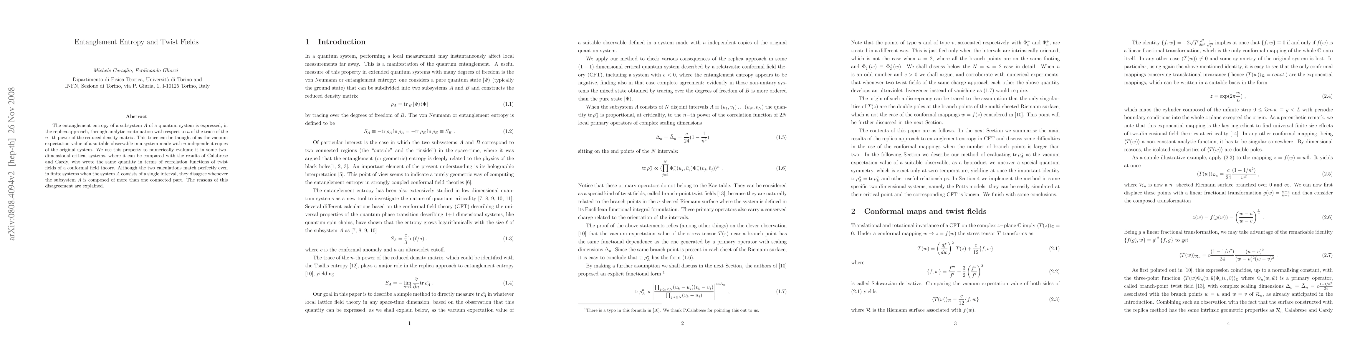 The entanglement entropy of a subsystem of a quantum system is expressed, in the replica approach, through analytic continuation with respect to n of the trace of the n-th power of the reduced density matrix. This trace can be thought of as the vacuum expectation value of a suitable observable in a system made with n independent copies of the original system. We use this property to numerically evaluate it in some two-dimensional critical systems, where it can be compared with the results of Calabrese and Cardy, who wrote the same quantity in terms of correlation functions of twist fields of a conformal field theory. Although the two calculations match perfectly even in finite systems when the analyzed subsystem consists of a single interval, they disagree whenever the subsystem is composed of more than one connected part. The reasons of this disagreement are explained.