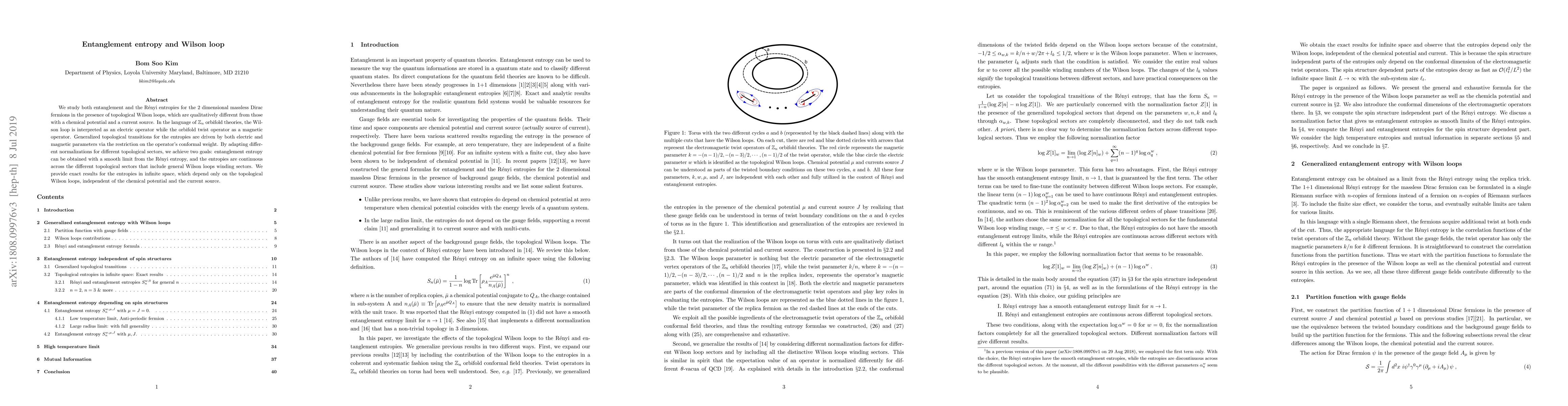 We study both entanglement and the R\'enyi entropies for the 2 dimensional massless Dirac fermions in the presence of topological Wilson loops, which are qualitatively different from those with a chemical potential and a current source. In the language of $\mathbb{Z}_n$ orbifold theories, the Wilson loop is interpreted as an electric operator while the orbifold twist operator as a magnetic operator. Generalized topological transitions for the entropies are driven by both electric and magnetic parameters via the restriction on the operator's conformal weight. By adapting different normalizations for different topological sectors, we achieve two goals: entanglement entropy can be obtained with a smooth limit from the R\'enyi entropy, and the entropies are continuous across the different topological sectors that include general Wilson loops winding sectors. We provide exact results for the entropies in infinite space, which depend only on the topological Wilson loops, independent of the chemical potential and the current source.