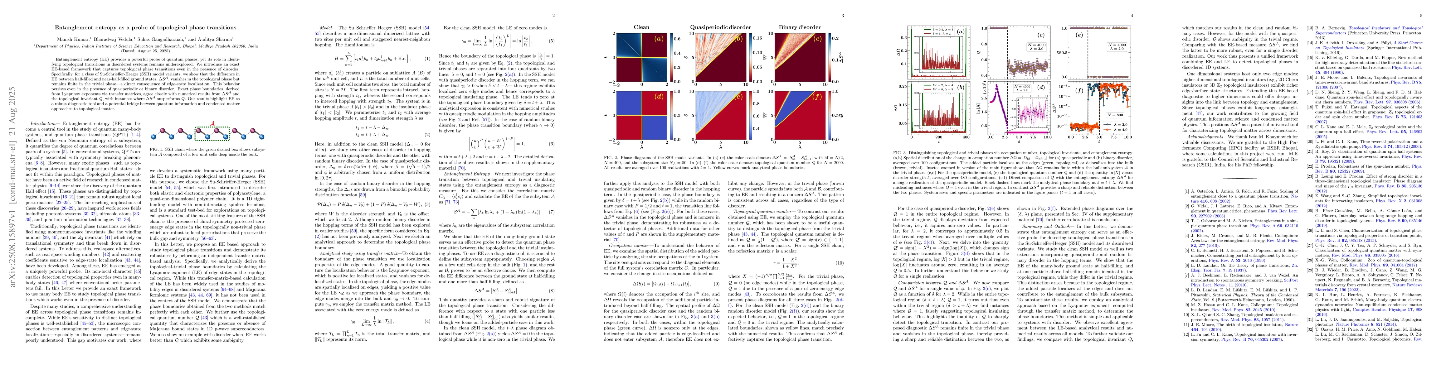 Entanglement entropy (EE) provides a powerful probe of quantum phases, yet its role in identifying topological transitions in disordered systems remains underexplored. We introduce an exact EE-based framework that captures topological phase transitions even in the presence of disorder. Specifically, for a class of Su-Schrieffer-Heeger (SSH) model variants, we show that the difference in EE between half-filled and near-half-filled ground states, $\Delta S^{\mathcal{A}}$, vanishes in the topological phase but remains finite in the trivial phase -- a direct consequence of edge-state localization. This behavior persists even in the presence of quasiperiodic or binary disorder. Exact phase boundaries, derived from Lyapunov exponents via transfer matrices, agree closely with numerical results from $\Delta S^{\mathcal{A}}$ and the topological invariant $\mathcal{Q}$, with instances where $\Delta S^{\mathcal{A}}$ outperforms $\mathcal{Q}$. Our results highlight EE as a robust diagnostic tool and a potential bridge between quantum information and condensed matter approaches to topological matter.