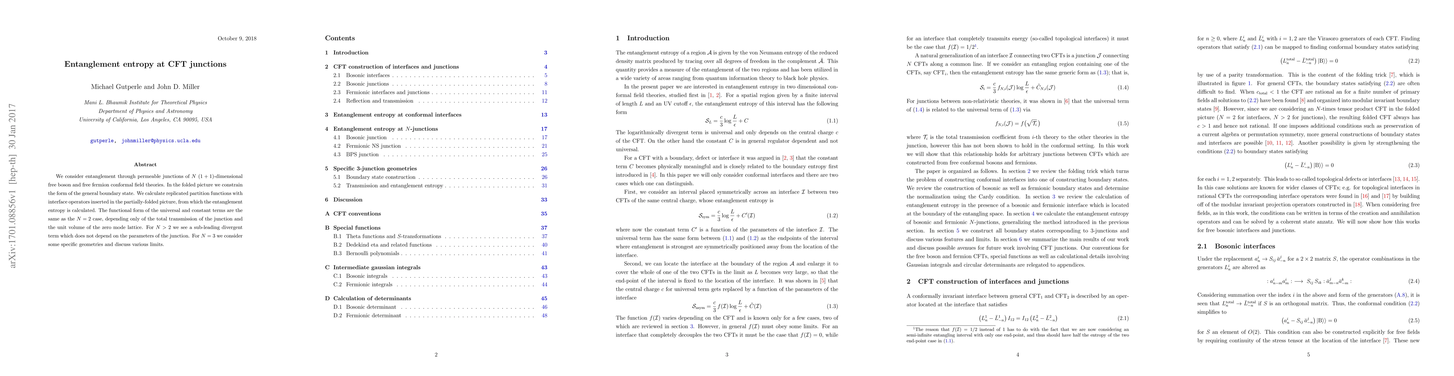 Researchers studied entanglement entropy at junctions of free boson and fermion conformal field theories, finding a universal form for the entropy depending on transmission through the junction and a sub-leading divergent term for N > 2.