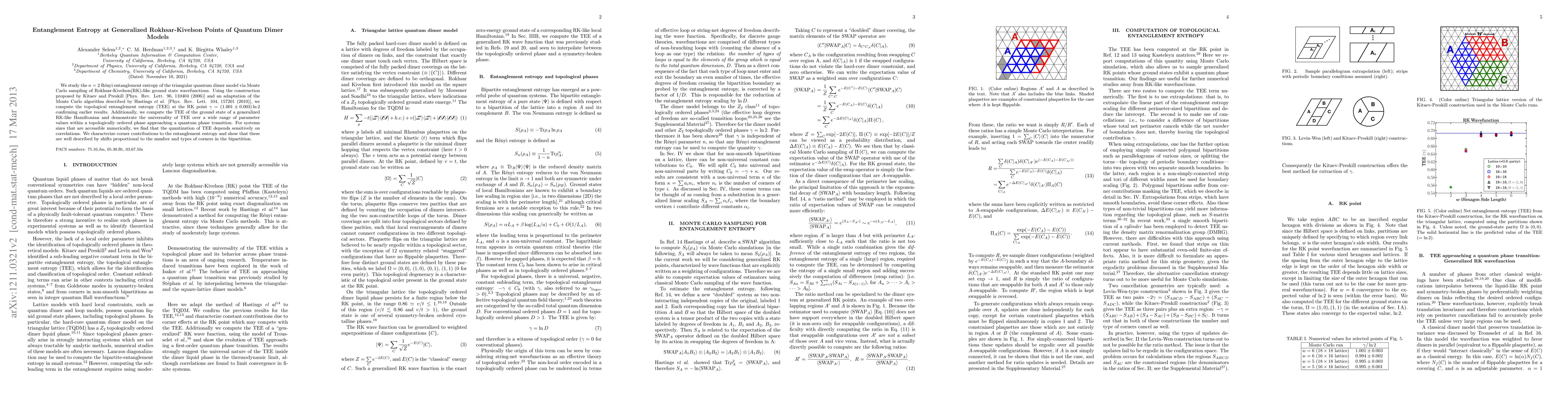 We study the $n=2$ R\' enyi entanglement entropy of the triangular quantum dimer model via Monte Carlo sampling of Rokhsar-Kivelson(RK)-like ground state wavefunctions. Using the construction proposed by Kitaev and Preskill [Phys. Rev. Lett. 96, 110404 (2006)] and an adaptation of the Monte Carlo algorithm described by Hastings \emph{et al.} [Phys. Rev. Lett. 104, 157201 (2010)], we compute the topological entanglement entropy (TEE) at the RK point $\gamma = (1.001 \pm 0.003) \ln 2$ confirming earlier results. Additionally, we compute the TEE of the ground state of a generalized RK-like Hamiltonian and demonstrate the universality of TEE over a wide range of parameter values within a topologically ordered phase approaching a quantum phase transition. For systems sizes that are accessible numerically, we find that the quantization of TEE depends sensitively on correlations. We characterize corner contributions to the entanglement entropy and show that these are well described by shifts proportional to the number and types of corners in the bipartition.