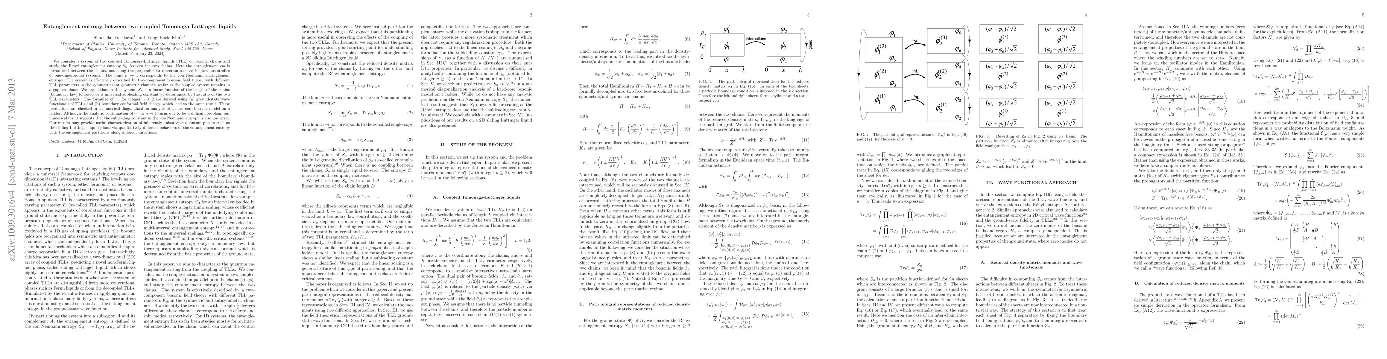 This paper studies the Renyi entanglement entropy $S_n$ between two coupled Tomonaga-Luttinger liquids on parallel chains, proposing that it follows a boundary law with a universal subleading constant $\gamma_n$ dependent on the ratio of their TLL parameters. Numerical analysis of a hard-core bosonic model supports the universality of $\gamma_n$ even for $n\to 1$.