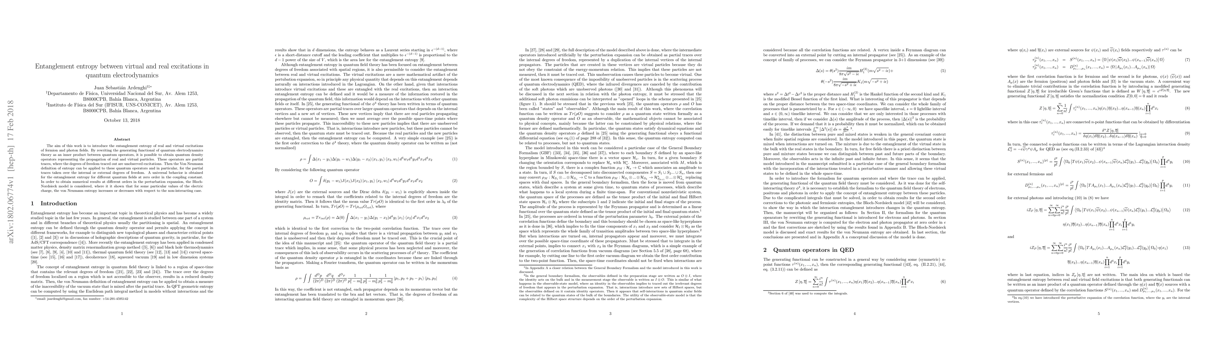 This research investigates the entanglement entropy of real and virtual excitations in quantum electrodynamics, deriving quantum density operators for real and virtual particles through a generating functional approach. It finds a universal behavior in entanglement entropy at zero coupling and shows variations in entropy under perturbation, using the Bloch-Nordsieck model.