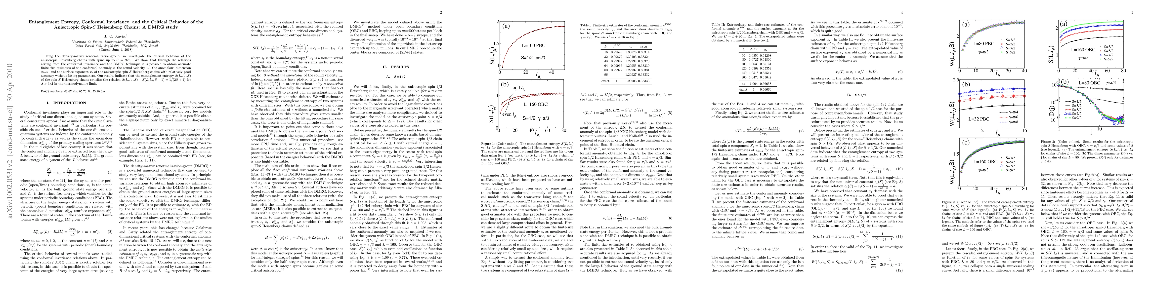 This study uses density-matrix renormalization-group to analyze the critical behavior of anisotropic Heisenberg chains, revealing accurate finite-size estimates of key parameters without fitting. The entanglement entropy relation $S(L,l_{A},S)-S(L,l_{A},S-1)=1/(2S+1)$ for $S>3/2$ is identified in the thermodynamic limit.