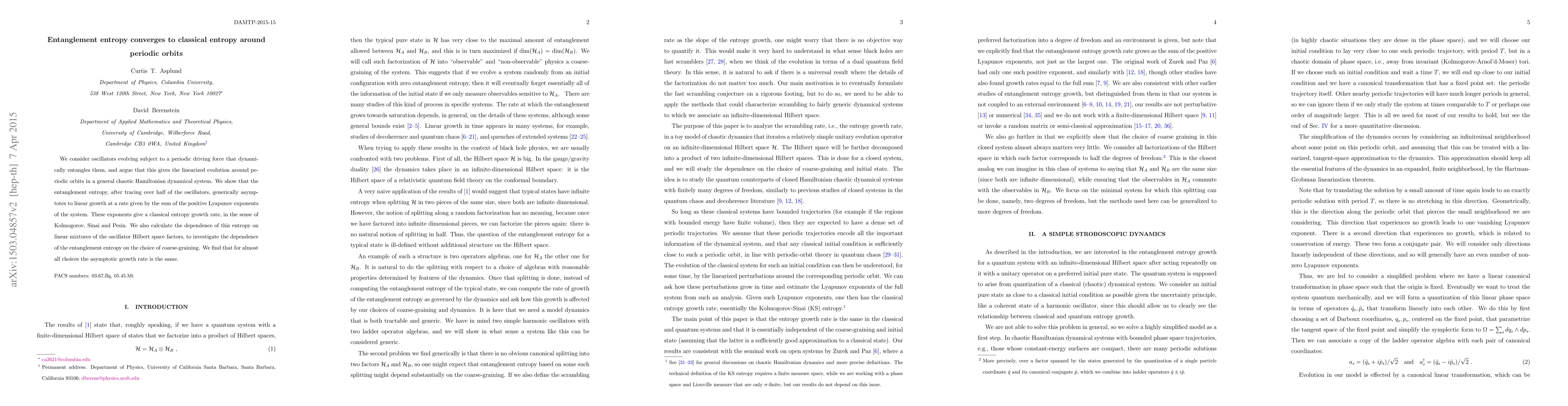This paper investigates the entanglement entropy of oscillators under periodic driving, showing that it converges to classical entropy growth rates associated with the positive Lyapunov exponents of the chaotic system. The study finds that the entanglement entropy asymptotes to linear growth, independent of most coarse-graining choices.