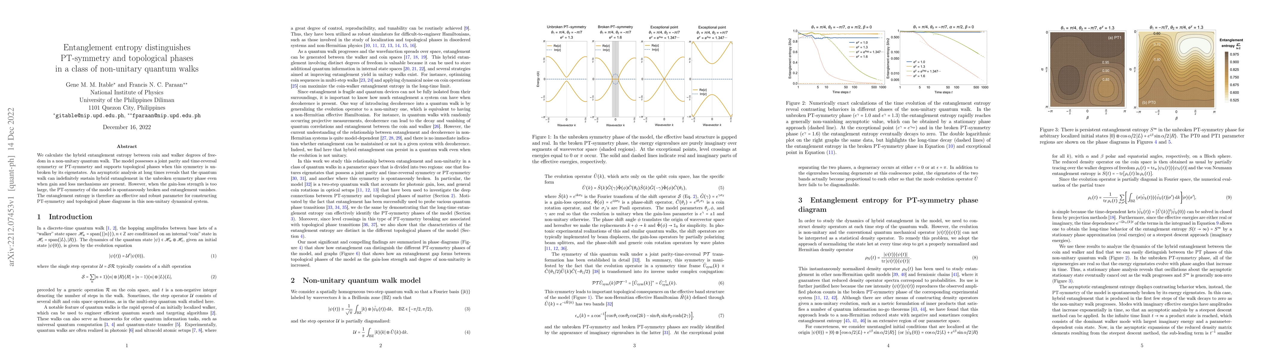 We calculate the hybrid entanglement entropy between coin and walker degrees of freedom in a non-unitary quantum walk. The model possesses a joint parity and time-reversal symmetry or PT-symmetry and supports topological phases when this symmetry is unbroken by its eigenstates. An asymptotic analysis at long times reveals that the quantum walk can indefinitely sustain hybrid entanglement in the unbroken symmetry phase even when gain and loss mechanisms are present. However, when the gain-loss strength is too large, the PT-symmetry of the model is spontaneously broken and entanglement vanishes. The entanglement entropy is therefore an effective and robust parameter for constructing PT-symmetry and topological phase diagrams in this non-unitary dynamical system.