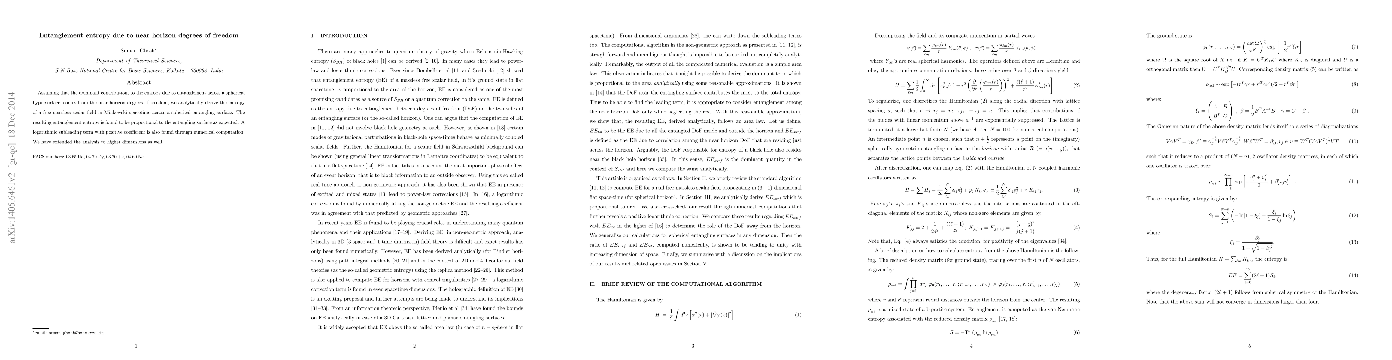 This paper analytically derives the entanglement entropy from near horizon degrees of freedom for a free massless scalar field in Minkowski spacetime, finding it proportional to the entangling surface area with a positive logarithmic subleading term. The analysis is extended to higher dimensions.