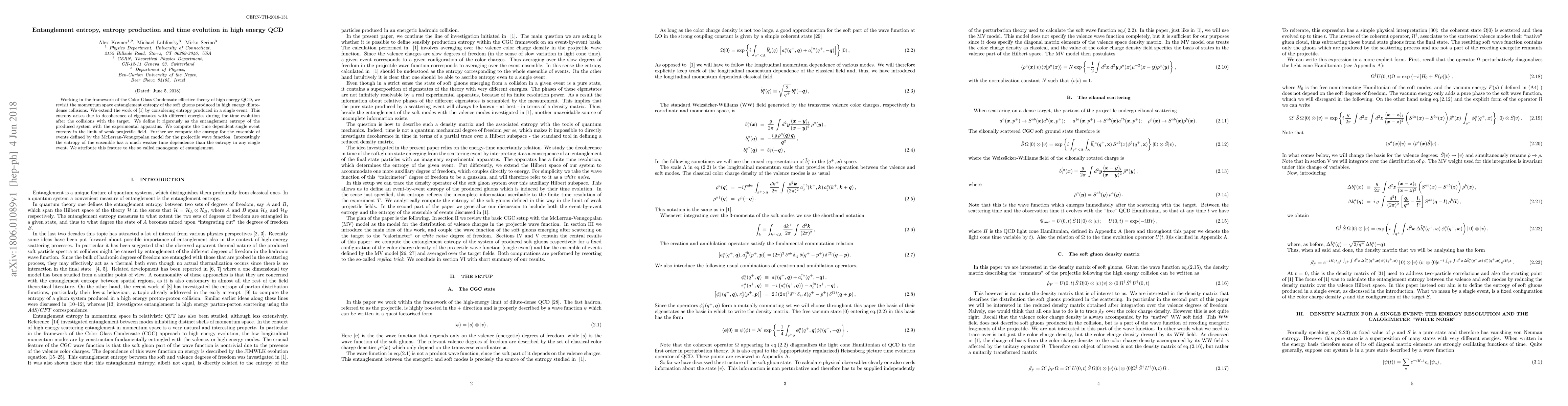 Working in the framework of the Color Glass Condensate effective theory of high energy QCD, we revisit the momentum space entanglement entropy of the soft gluons produced in high energy dilute-dense collisions. We extend the work of~\cite{Kovner:2015hga} by considering entropy produced in a single event. This entropy arises due to decoherence of eigenstates with different energies during the time evolution after the collisions with the target. We define it rigorously as the entanglement entropy of the produced system with the experimental apparatus. We compute the time dependent single event entropy in the limit of weak projectile field. Further we compute the entropy for the ensemble of events defined by the McLerran-Venugopalan model for the projectile wave function. Interestingly the entropy of the ensemble has a much weaker time dependence than the entropy in any single event. We attribute this feature to the so called monogamy of entanglement.