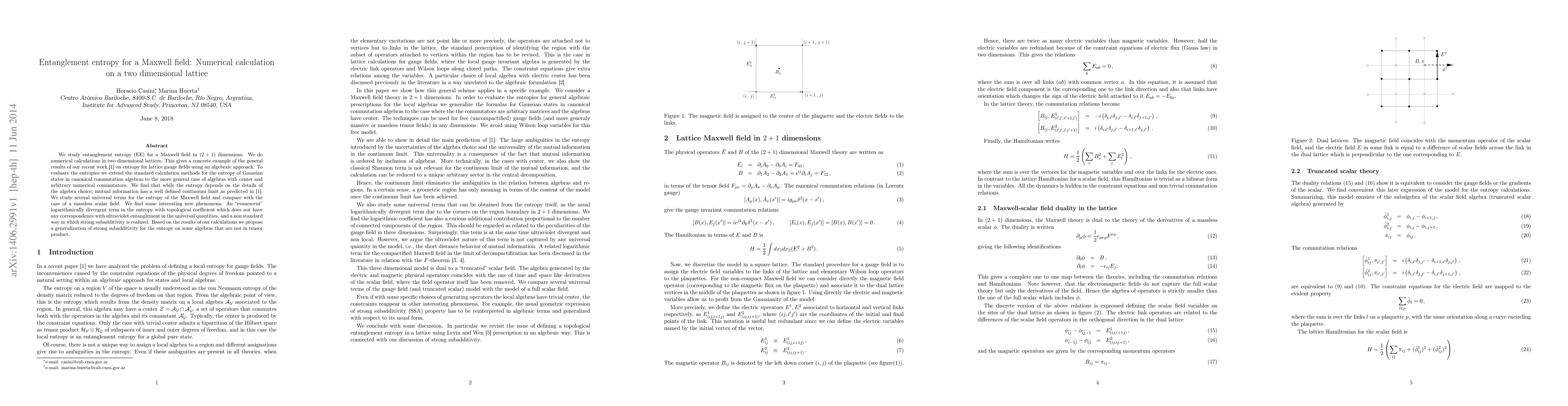 This paper numerically calculates entanglement entropy for a Maxwell field in 2+1 dimensions on a lattice, extending methods for Gaussian states to more general algebras. It reveals new phenomena, including an evanescent logarithmic divergence and a non-standard realization of strong subadditivity, proposing a generalized form for non-tensor product algebras.