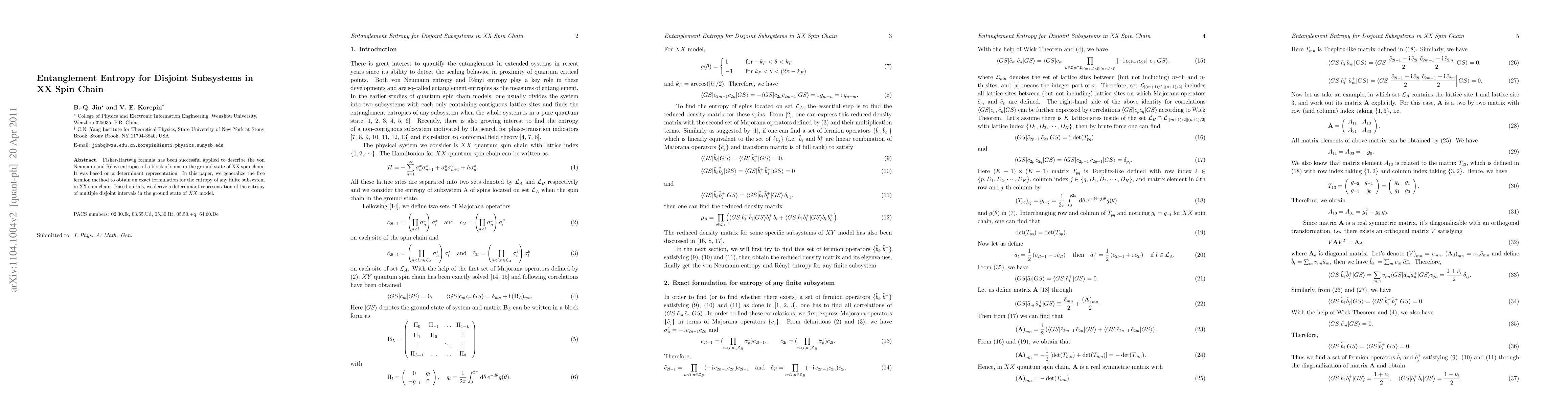 The development of a determinant representation for the entropy of any finite subsystem in the XX spin chain.