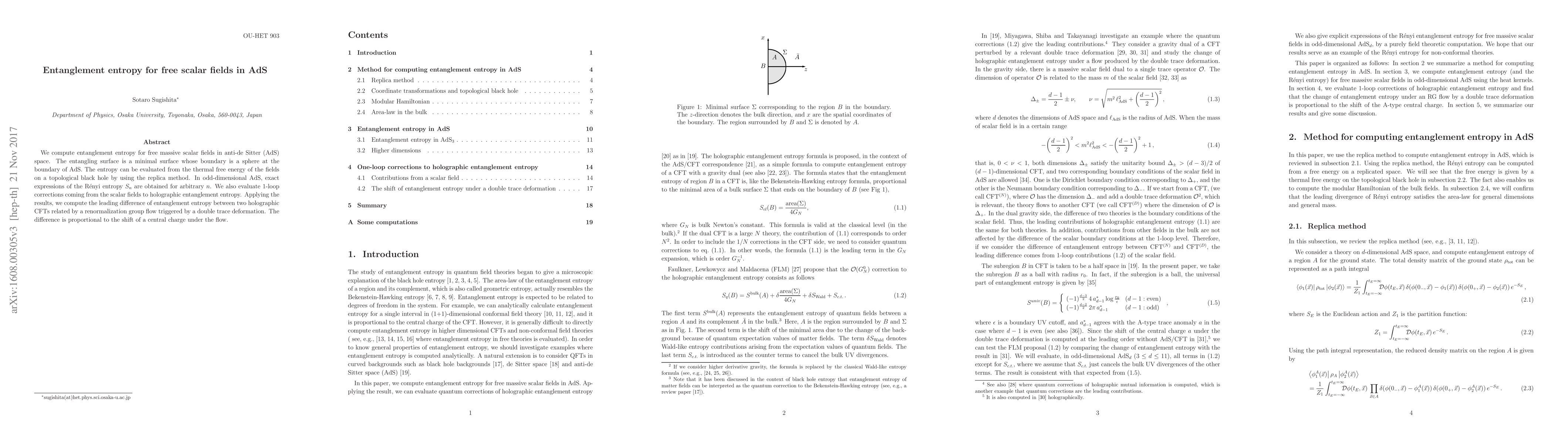 We compute entanglement entropy for free massive scalar fields in anti-de Sitter (AdS) space. The entangling surface is a minimal surface whose boundary is a sphere at the boundary of AdS. The entropy can be evaluated from the thermal free energy of the fields on a topological black hole by using the replica method. In odd-dimensional AdS, exact expressions of the Renyi entropy $S_n$ are obtained for arbitrary $n$. We also evaluate 1-loop corrections coming from the scalar fields to holographic entanglement entropy. Applying the results, we compute the leading difference of entanglement entropy between two holographic CFTs related by a renormalization group flow triggered by a double trace deformation. The difference is proportional to the shift of a central charge under the flow.