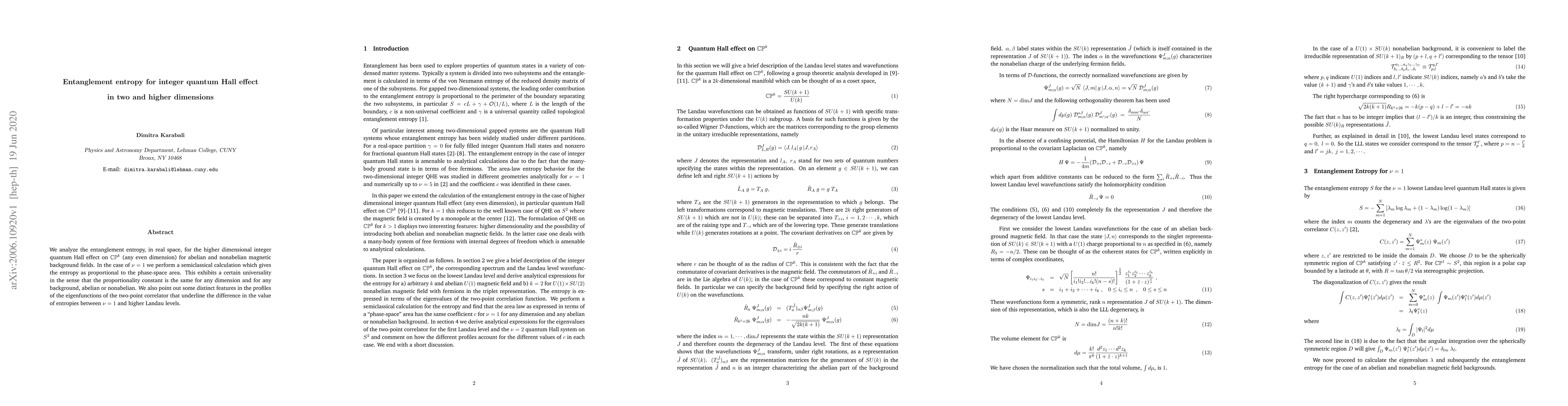 This paper investigates the entanglement entropy in higher-dimensional integer quantum Hall systems, revealing a universal proportionality constant for $\nu=1$ in both abelian and nonabelian magnetic fields. It highlights unique eigenfunction profiles distinguishing $\nu=1$ from higher Landau levels.
