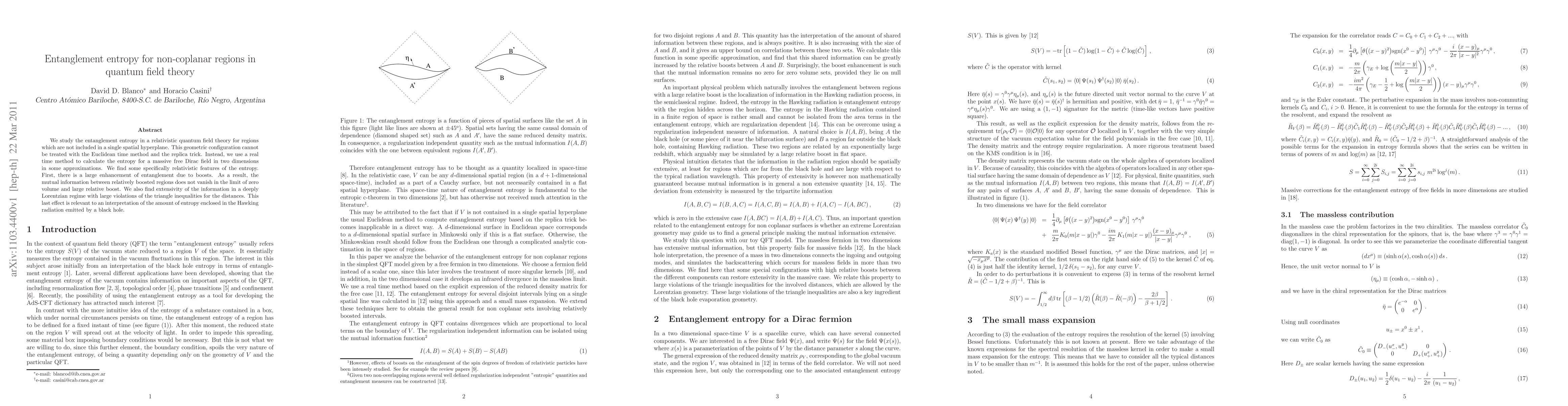 Researchers studied entanglement entropy in quantum field theory for non-coplanar regions, finding a large enhancement of entanglement due to boosts and extensivity of information in certain regimes, with implications for understanding Hawking radiation and black hole behavior.