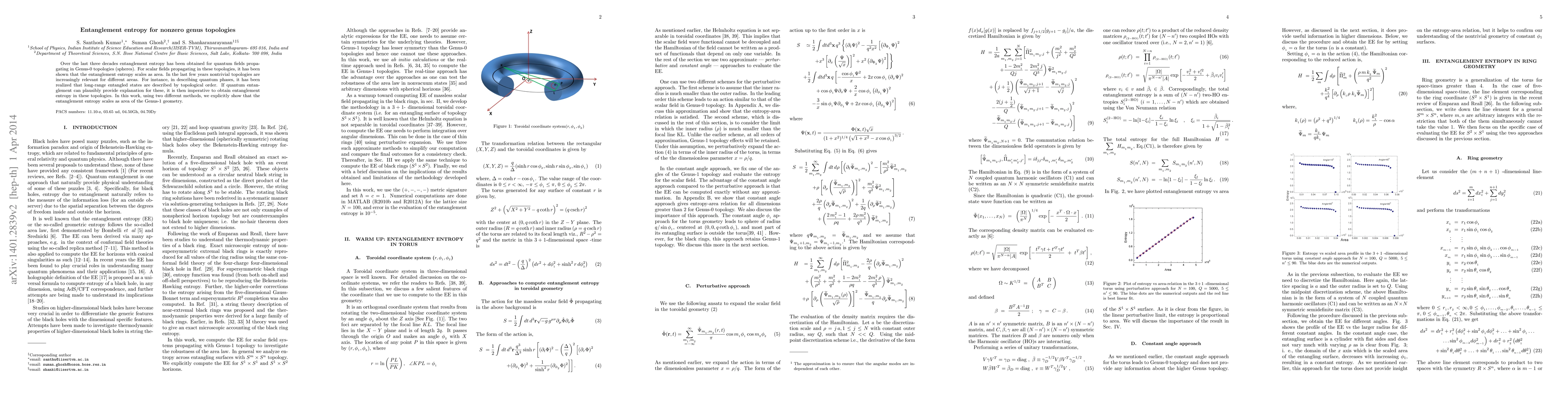 This paper investigates entanglement entropy for quantum fields in genus-1 topologies, demonstrating that it scales as the area of the surface, extending the area law to non-trivial topologies. This finding is crucial for understanding quantum phases and topological order.