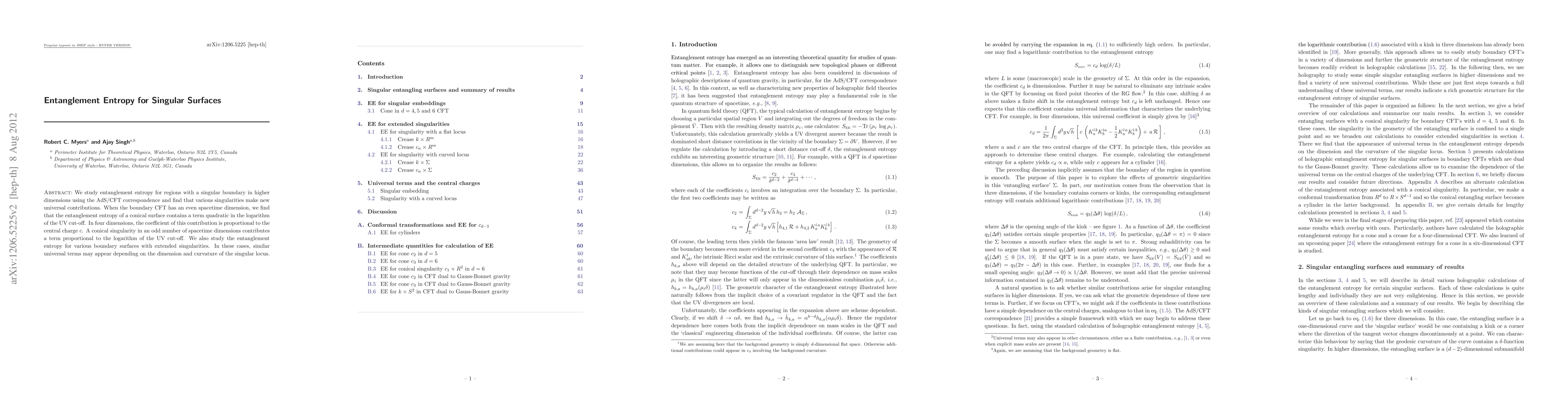 We study entanglement entropy for regions with a singular boundary in higher dimensions using the AdS/CFT correspondence and find that various singularities make new universal contributions. When the boundary CFT has an even spacetime dimension, we find that the entanglement entropy of a conical surface contains a term quadratic in the logarithm of the UV cut-off. In four dimensions, the coefficient of this contribution is proportional to the central charge 'c'. A conical singularity in an odd number of spacetime dimensions contributes a term proportional to the logarithm of the UV cut-off. We also study the entanglement entropy for various boundary surfaces with extended singularities. In these cases, similar universal terms may appear depending on the dimension and curvature of the singular locus.