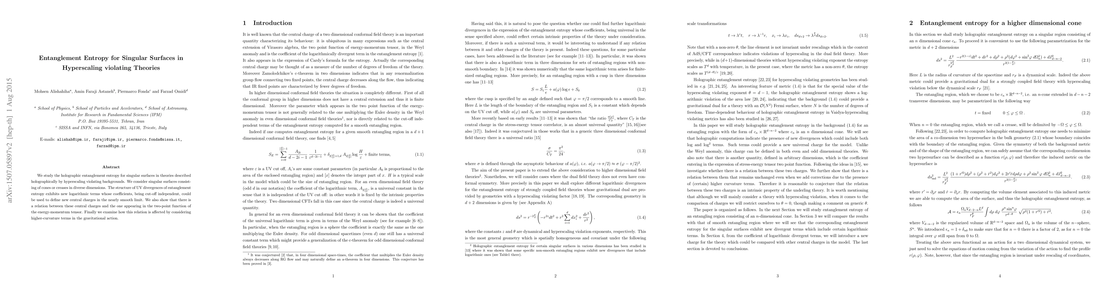 This paper investigates the holographic entanglement entropy for singular surfaces in hyperscaling violating theories, revealing new logarithmic UV divergences that define new central charges. It also explores the connection between these central charges and the energy-momentum tensor's two-point function, and examines the impact of higher-curvature gravitational terms on this relation.