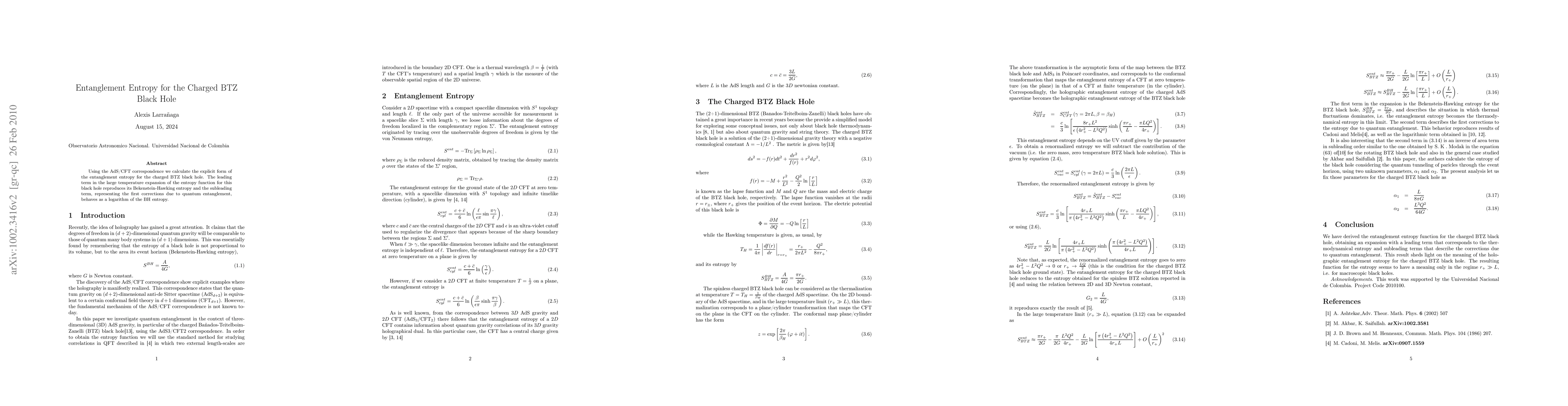 The study calculates the entanglement entropy for a charged BTZ black hole using the AdS/CFT correspondence, revealing that the leading term matches the Bekenstein-Hawking entropy, while the subleading logarithmic term represents quantum entanglement corrections.