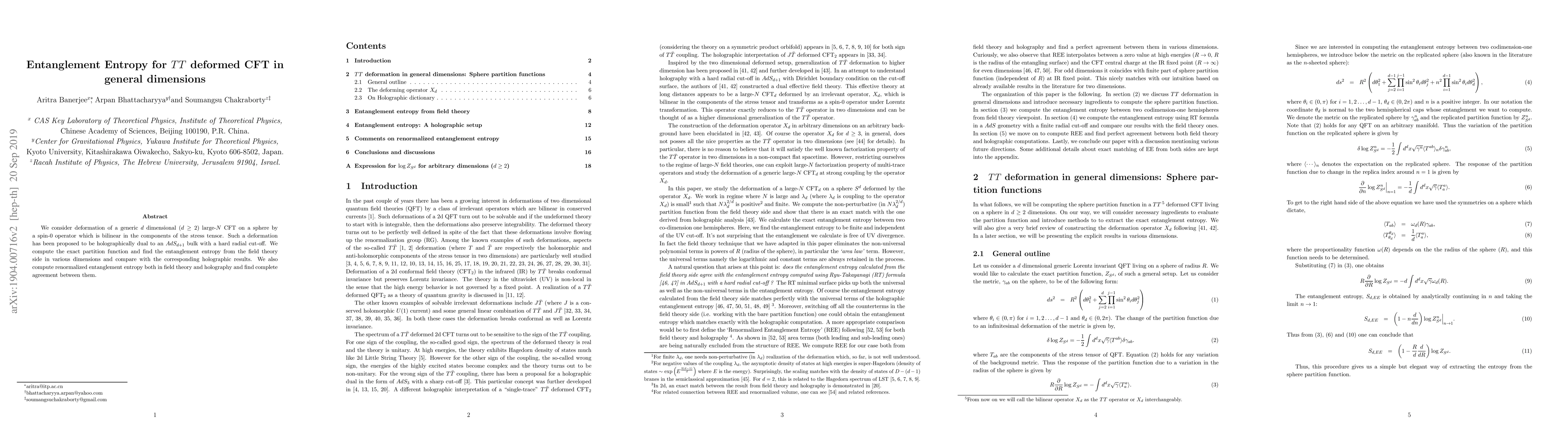 We consider deformation of a generic $d$ dimensional ($d\geq 2$) large-$N$ CFT on a sphere by a spin-0 operator which is bilinear in the components of the stress tensor. Such a deformation has been proposed to be holographically dual to an $AdS_{d+1}$ bulk with a hard radial cut-off. We compute the exact partition function and find the entanglement entropy from the field theory side in various dimensions and compare with the corresponding holographic results. We also compute renormalized entanglement entropy both in field theory and holography and find complete agreement between them.