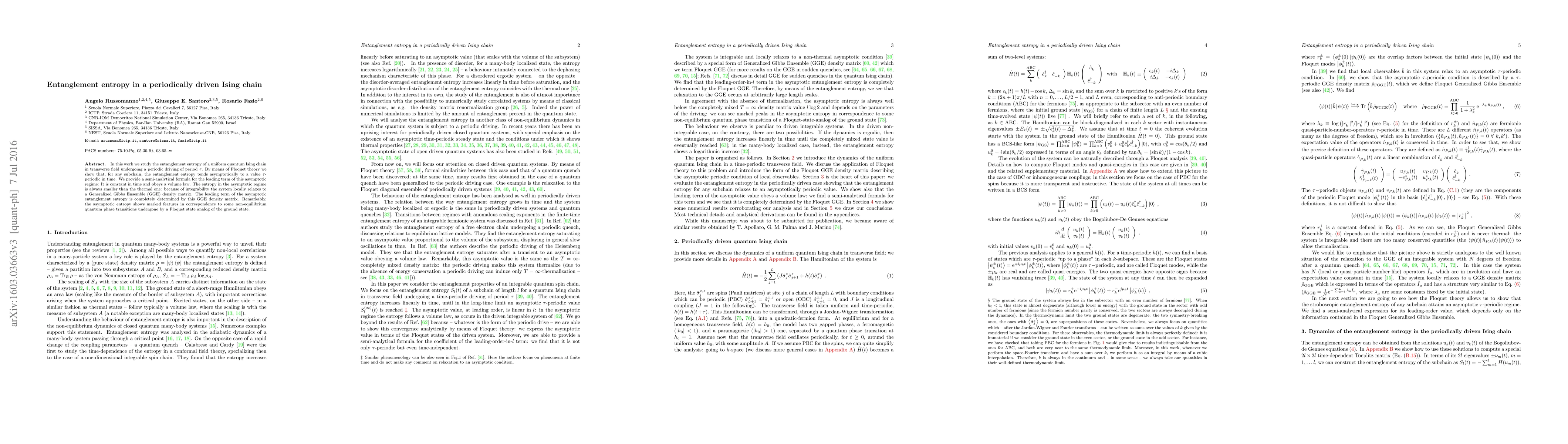 This study examines the entanglement entropy in a periodically driven quantum Ising chain, revealing that it asymptotically reaches a time-periodic value determined by the driving period. The leading term of this entropy, governed by a Generalized Gibbs Ensemble, obeys a volume law and is smaller than the thermal entropy, highlighting features of non-equilibrium quantum phase transitions.