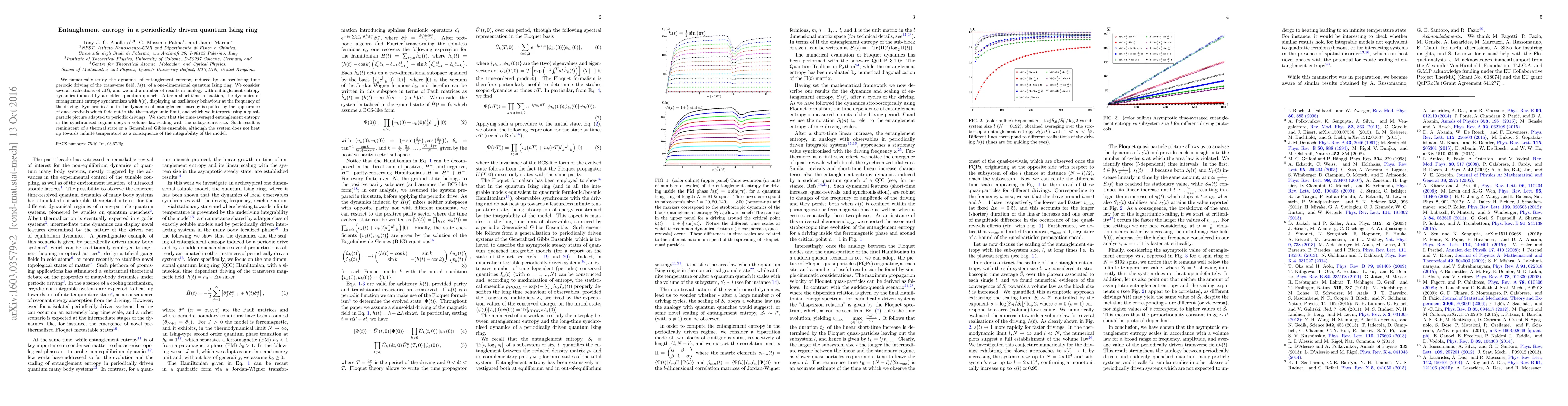 We numerically study the dynamics of entanglement entropy, induced by an oscillating time periodic driving of the transverse field, h(t), of a one-dimensional quantum Ising chain. We consider several realizations of h(t), and we find a number of results in analogy with entanglement entropy dynamics induced by a sudden quantum quench. After short-time relaxation, the dynamics of entanglement entropy synchronises with h(t), displaying an oscillatory behaviour at the frequency of the driving. Synchronisation in the dynamics of entanglement entropy, is spoiled by the appearance of quasi-revivals which fade out in the thermodynamic limit, and which we interpret using a quasi-particle picture adapted to periodic drivings. Taking the time-average of the entanglement entropy in the synchronised regime, we find that it obeys a volume law scaling with the subsystem's size. Such result is reminiscent of a thermal state or of a Generalised Gibbs ensemble of a quenched Ising chain, although the system does not heat up towards infinite temperature as a consequence of the integrability of the model.
