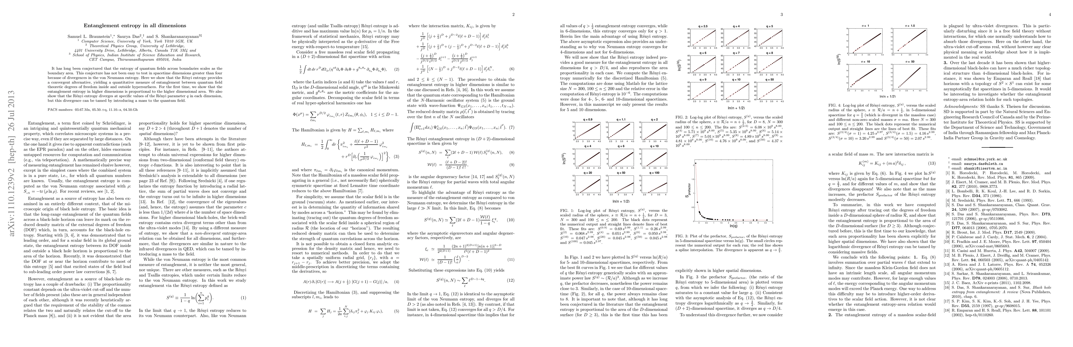 It has long been conjectured that the entropy of quantum fields across boundaries scales as the boundary area. This conjecture has not been easy to test in spacetime dimensions greater than four because of divergences in the von Neumann entropy. Here we show that the Renyi entropy provides a convergent alternative, yielding a quantitative measure of entanglement between quantum field theoretic degrees of freedom inside and outside hypersurfaces. For the first time, we show that the entanglement entropy in higher dimensions is proportional to the higher dimensional area. We also show that the Renyi entropy diverges at specific values of the Renyi parameter (q) in each dimension, but this divergence can be tamed by introducing a mass of the quantum field.
