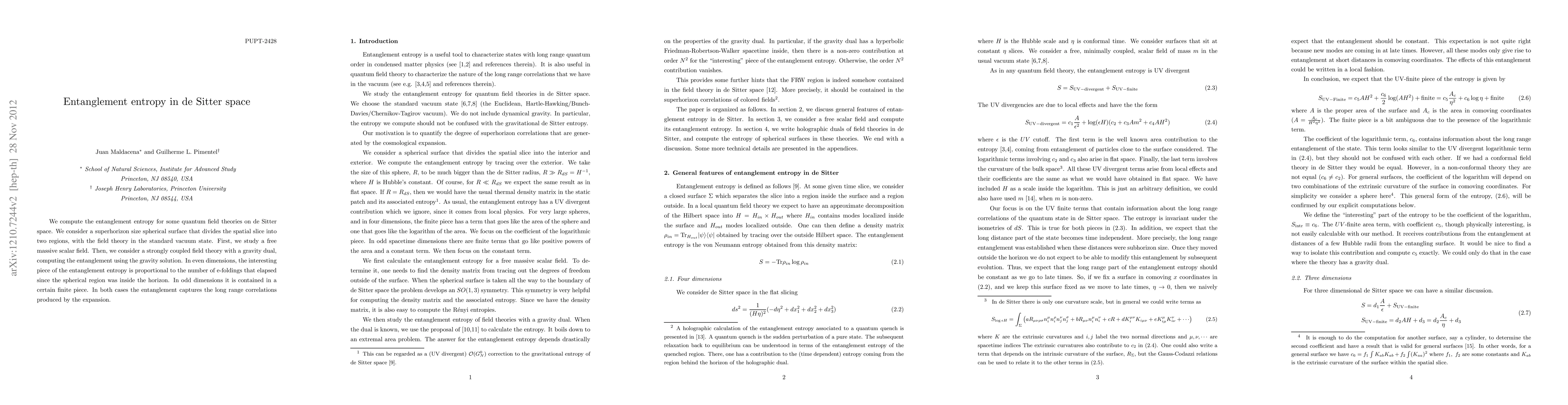 This paper computes the entanglement entropy for quantum field theories on de Sitter space, focusing on a superhorizon spherical surface. It finds that in even dimensions, the entanglement entropy is proportional to the number of e-foldings since the region was inside the horizon, while in odd dimensions it is contained in a finite piece, capturing long-range correlations due to expansion.