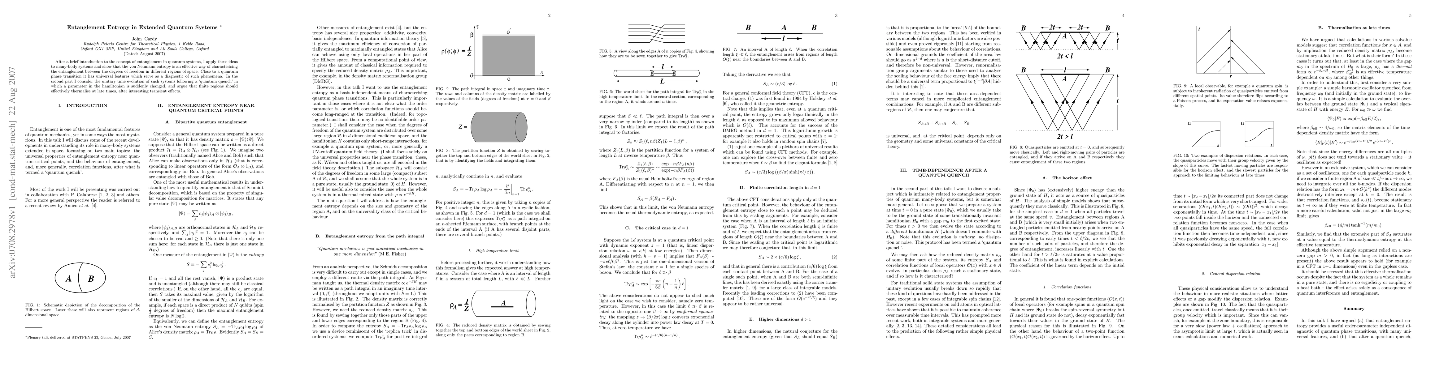 This paper explores the use of von Neumann entropy to characterize entanglement in extended quantum systems, highlighting its universal features near quantum phase transitions. It also examines the thermalization behavior of finite regions following a quantum quench, noting transient effects before thermalization.