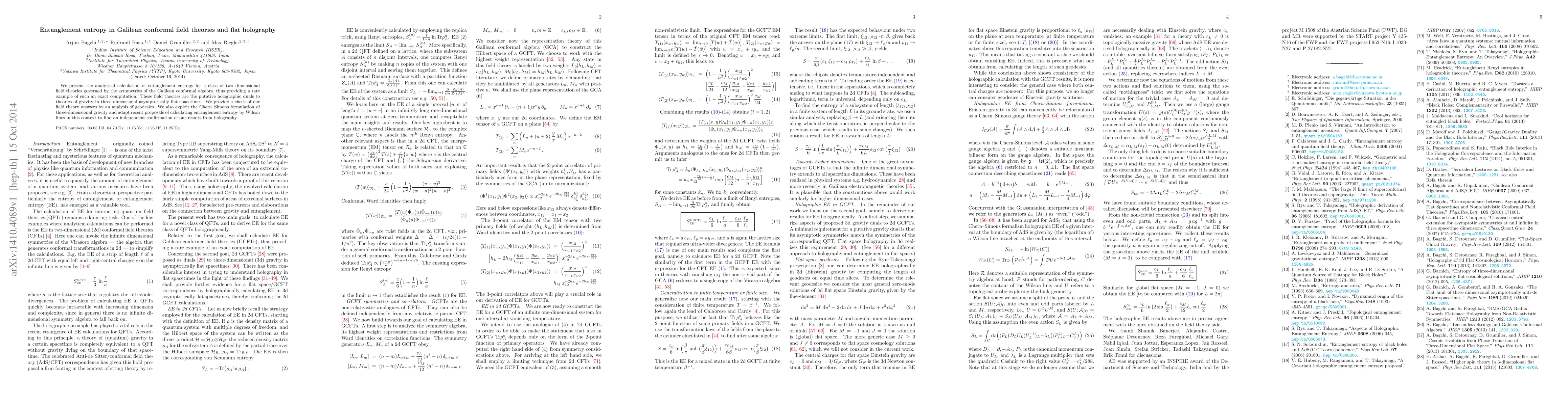 This paper analytically computes entanglement entropy for two-dimensional Galilean conformal field theories, offering an exact result and linking these to three-dimensional asymptotically flat gravity theories via holography. Independent confirmation is achieved through geodesic analysis and holographic calculations using Chern-Simons formulations.