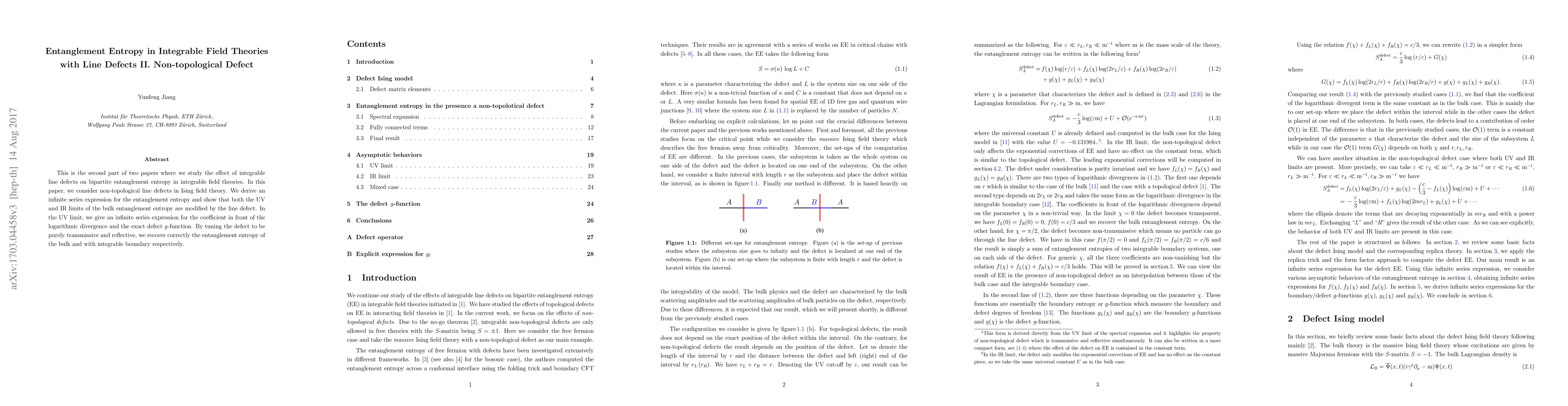 This is the second part of two papers where we study the effect of integrable line defects on bipartite entanglement entropy in integrable field theories. In this paper, we consider non-topological line defects in Ising field theory. We derive an infinite series expression for the entanglement entropy and show that both the UV and IR limits of the bulk entanglement entropy are modified by the line defect. In the UV limit, we give an infinite series expression for the coefficient in front of the logarithmic divergence and the exact defect $g$-function. By tuning the defect to be purely transmissive and reflective, we recover correctly the entanglement entropy of the bulk and with integrable boundary.