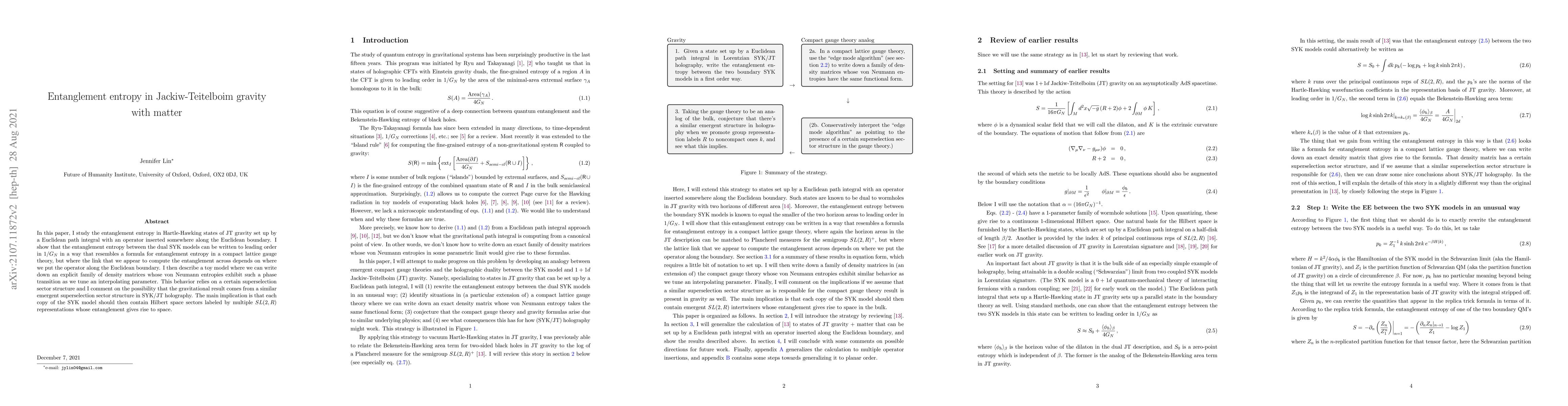 In this paper, I study the entanglement entropy in Hartle-Hawking states of JT gravity set up by a Euclidean path integral with an operator inserted somewhere along the Euclidean boundary. I show that the entanglement entropy between the dual SYK models can be written to leading order in $1/G_N$ in a way that resembles a formula for entanglement entropy in a compact lattice gauge theory, but where the link that we appear to compute the entanglement across depends on where we put the operator along the Euclidean boundary. I then describe a toy model where we can write down an explicit family of density matrices whose von Neumann entropies exhibit such a phase transition as we tune an interpolating parameter. This behavior relies on a certain superselection sector structure and I comment on the possibility that the gravitational result comes from a similar emergent superselection sector structure in SYK/JT holography. The main implication is that each copy of the SYK model should then contain Hilbert space sectors labeled by multiple $SL(2,R)$ representations whose entanglement gives rise to space.