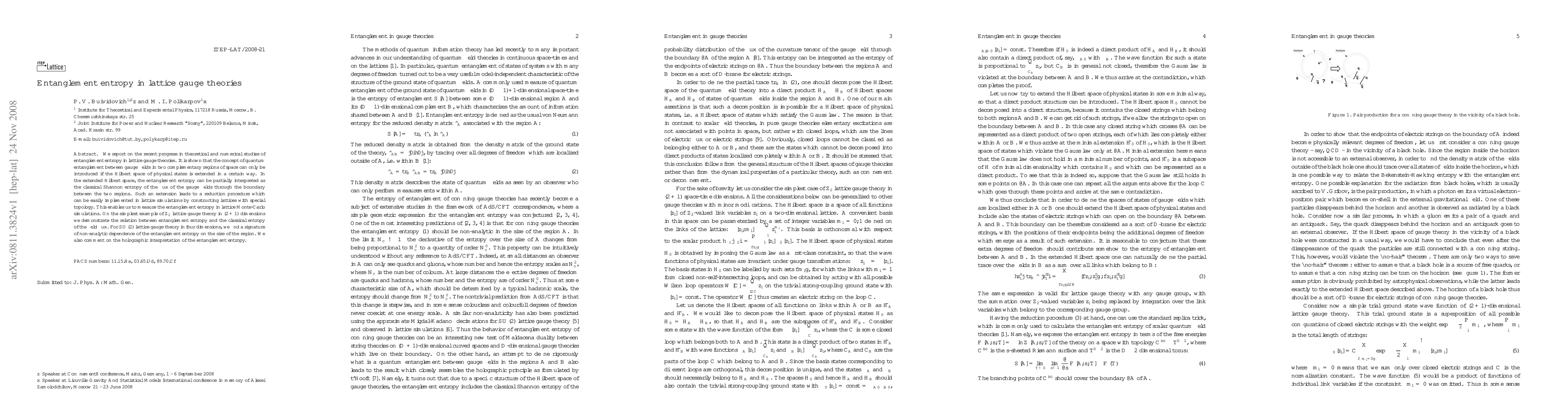 The paper discusses advancements in studying entanglement entropy in lattice gauge theories, showing that quantum entanglement between gauge fields necessitates an extended Hilbert space. It demonstrates a reduction procedure enabling entanglement entropy measurement in lattice simulations, and presents results from Z2 and SU(2) lattice gauge theories, including a non-analytic dependence in the latter and a holographic interpretation.