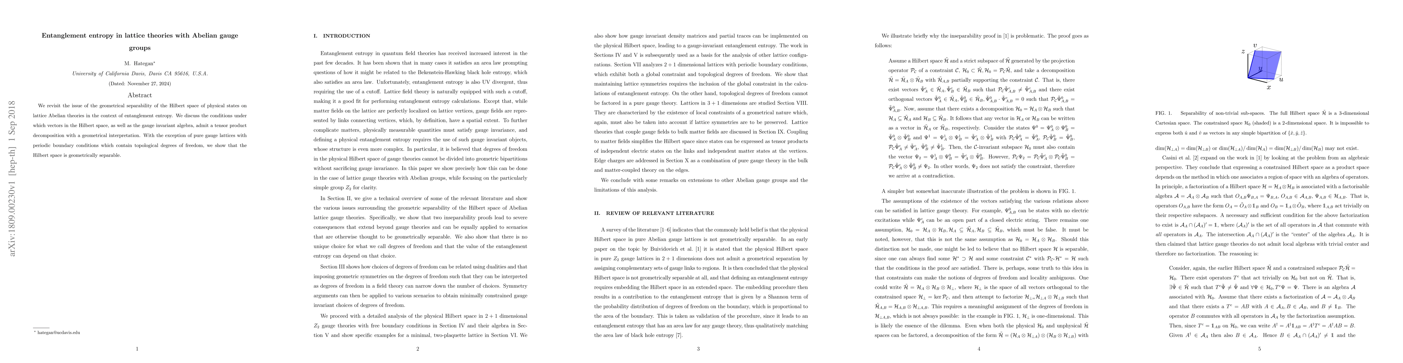 This paper explores the entanglement entropy in lattice Abelian gauge theories and demonstrates that, except for pure gauge lattices with periodic boundaries, the Hilbert space of physical states is geometrically separable, allowing for a tensor product decomposition.